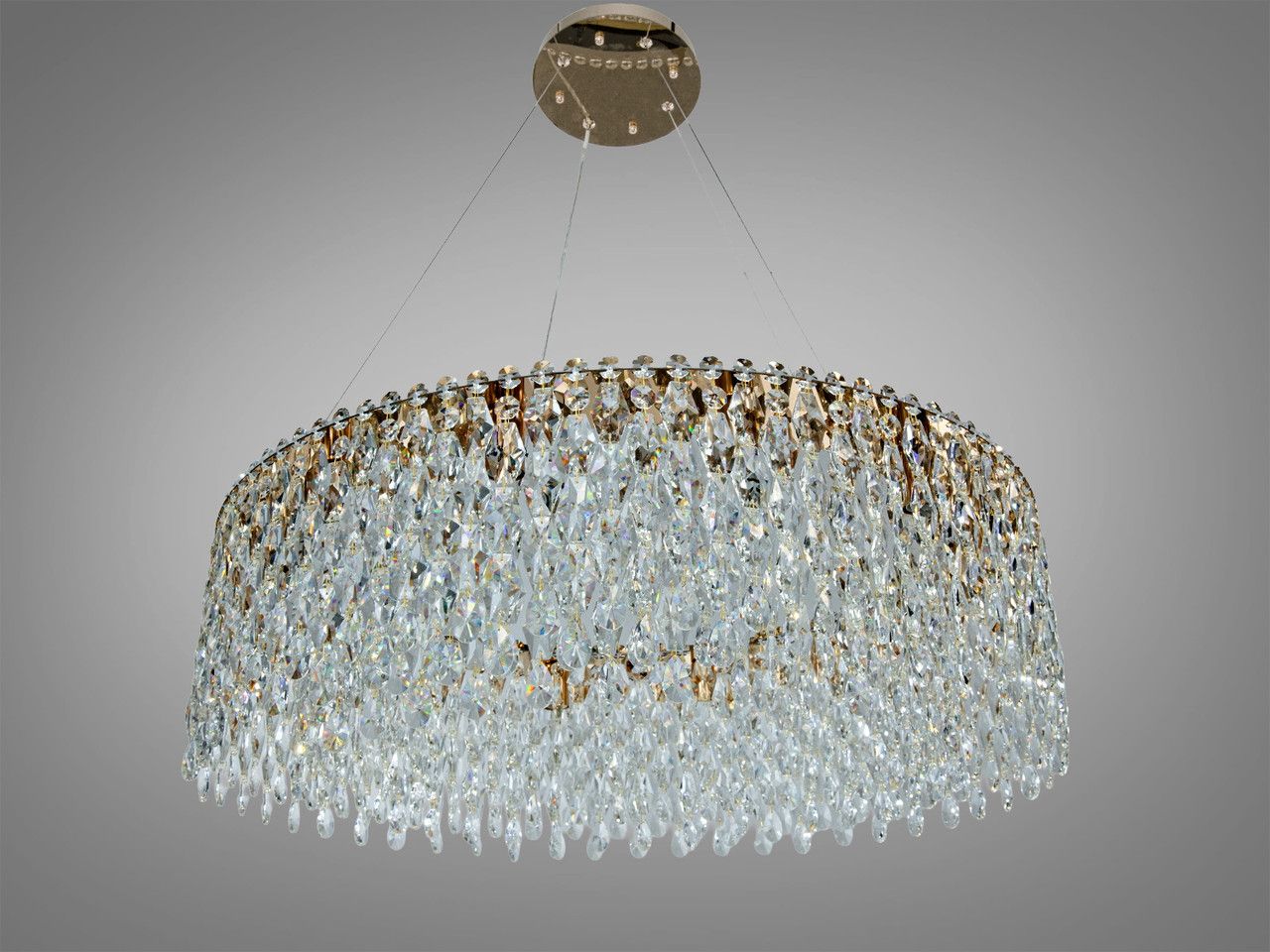 Велична підвісна люстра, виготовлена в стилі сучасний модерн. Модель являє собою масивну циліндричну конструкцію із золотистого металу, прикрашену багатоярусним каскадом із прозорих кришталевих підвісок. Завдяки наявності дванадцяти джерел світла та чималому діаметру (78 см), цей світильник стане домінантним елементом інтер'єру просторої вітальні, урочистого залу або елітного ресторану.