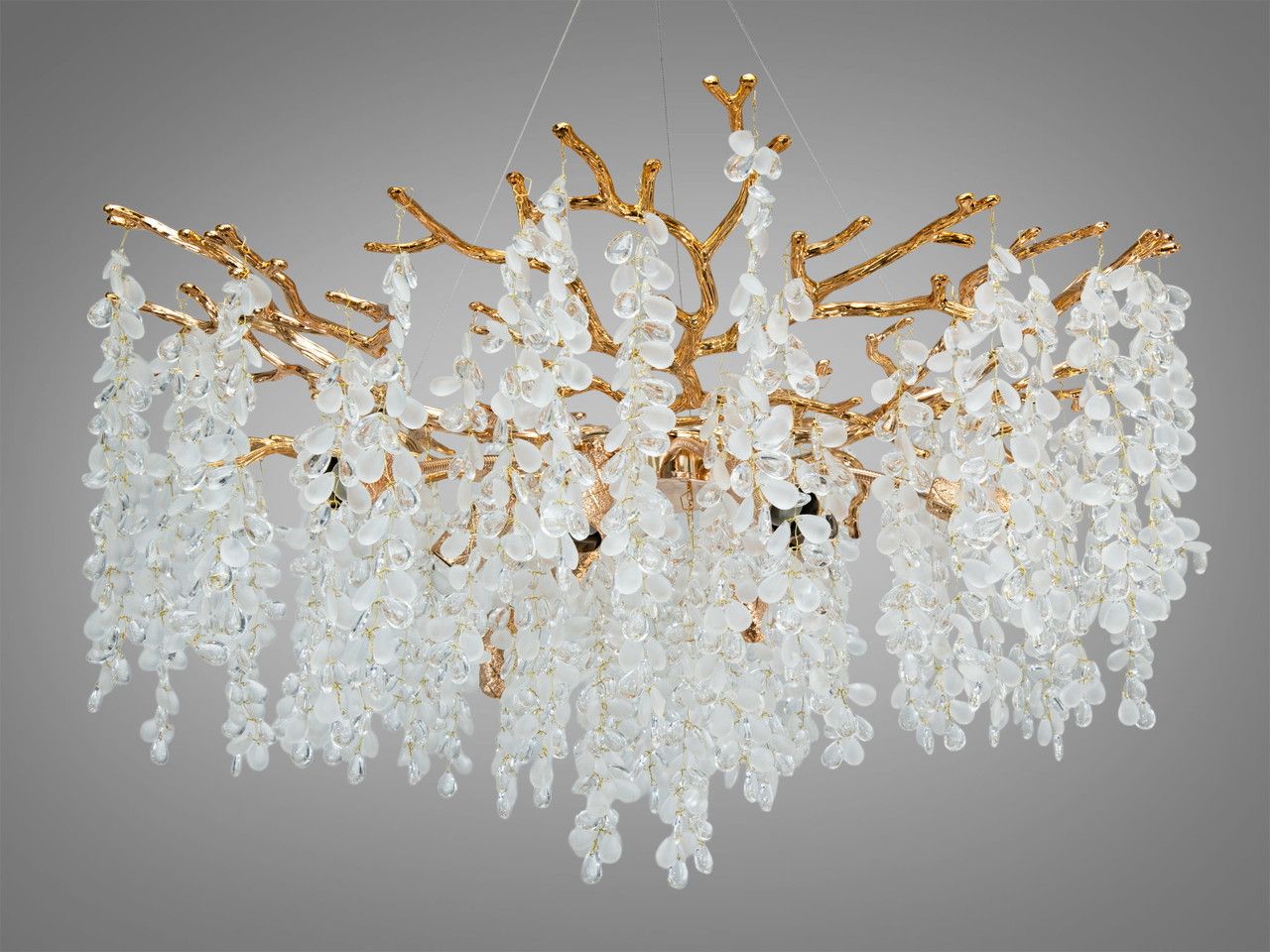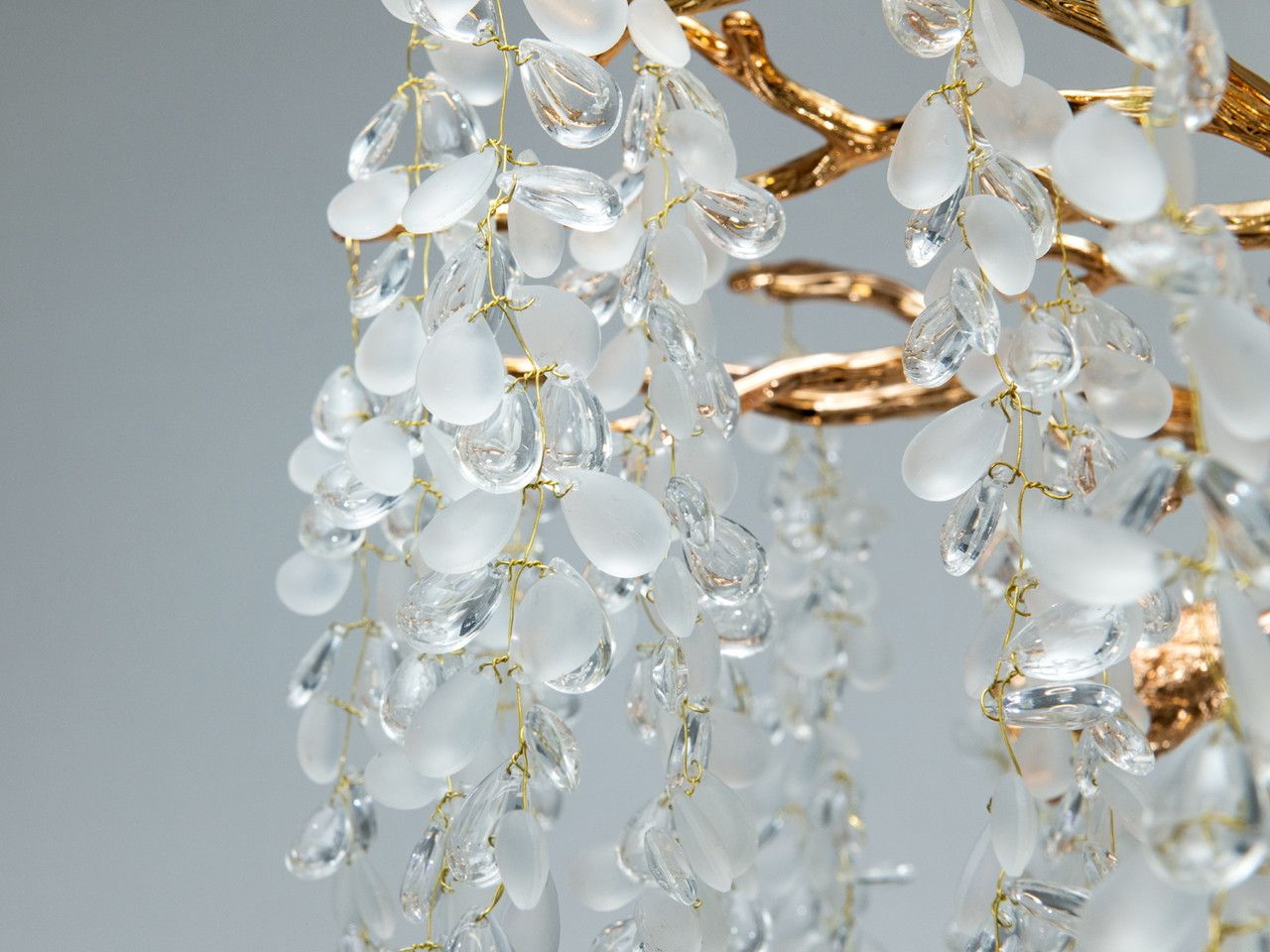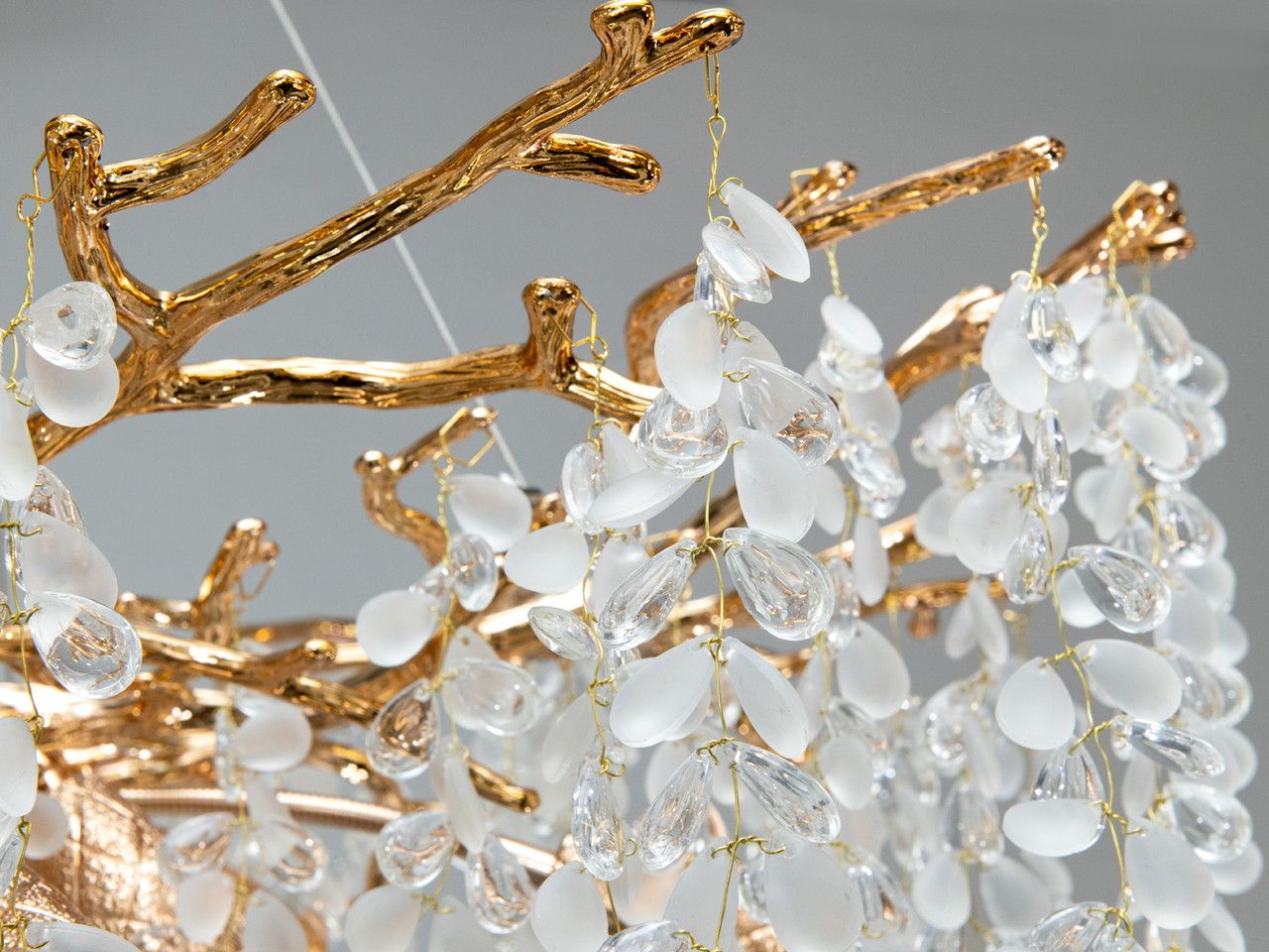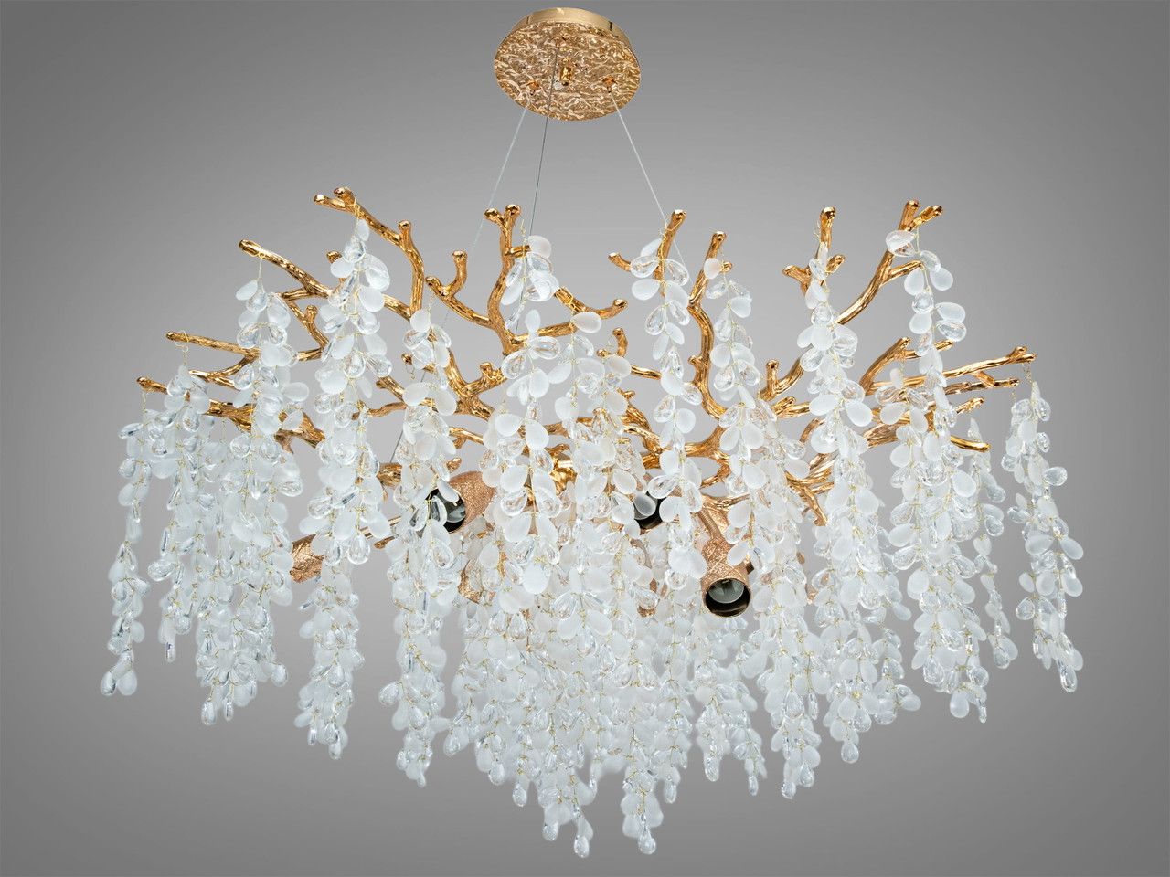 Велична підвісна люстра, виготовлена в стилі сучасний модерн з елементами флористики. Модель являє собою складану металеву конструкцію в кольорі глянсового золота, схожу на гілки дерева, густо прикрашені каскадом із прозорих кришталевих підвісок у формі крапель. Завдяки десяти джерелам світла та чималому діаметру (76 см), цей світильник стане домінантним елементом інтер'єру просторої вітальні, спальні або урочистого залу.