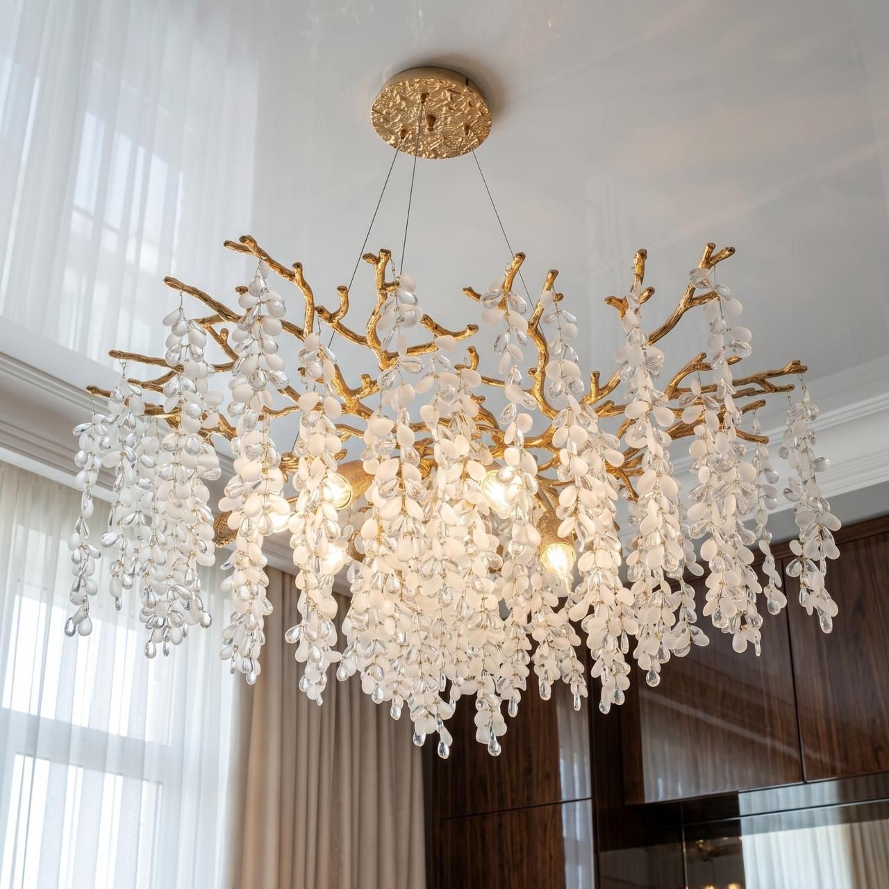 Унікальний дизайн: форма, що імітує природні мотиви (ввітви з краплями), виділяє цю люстру серед класичних каскадних моделей.