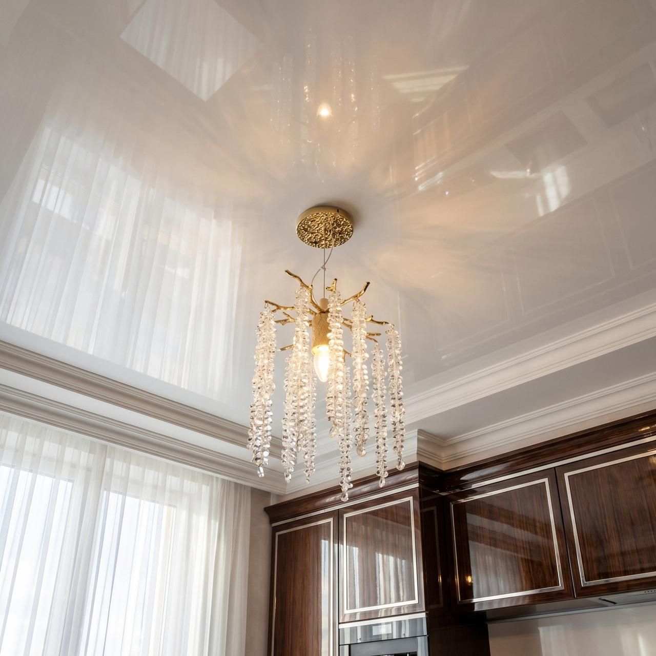 Підвіс може бути стильною альтернативою приліжкових ламп. Розташування світильника з обох боків наголов'я ліжка додасть кімнаті візуальної легкості, а кришталеві краплі забезпечать м'яке заломлення світла, що не втомлює зір.