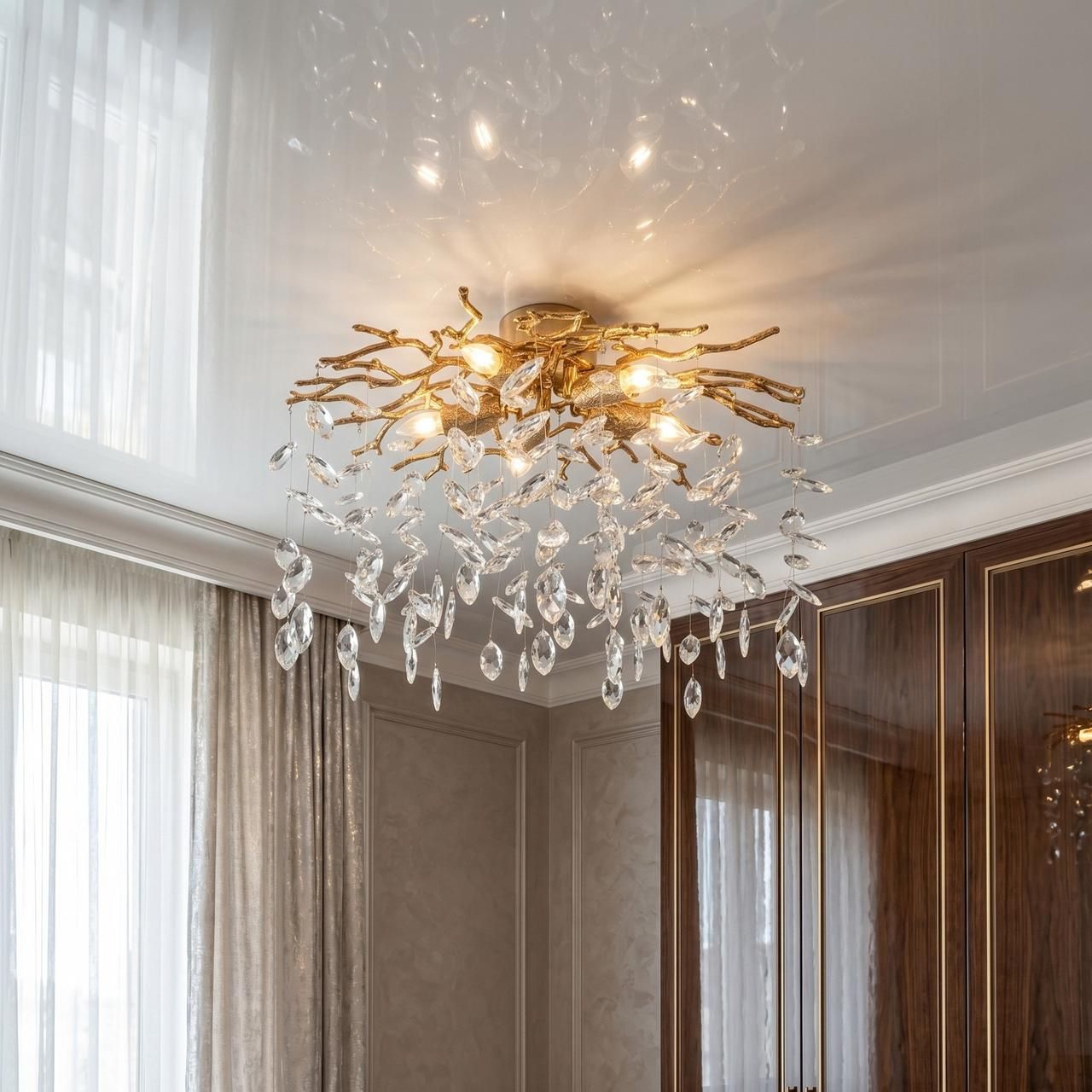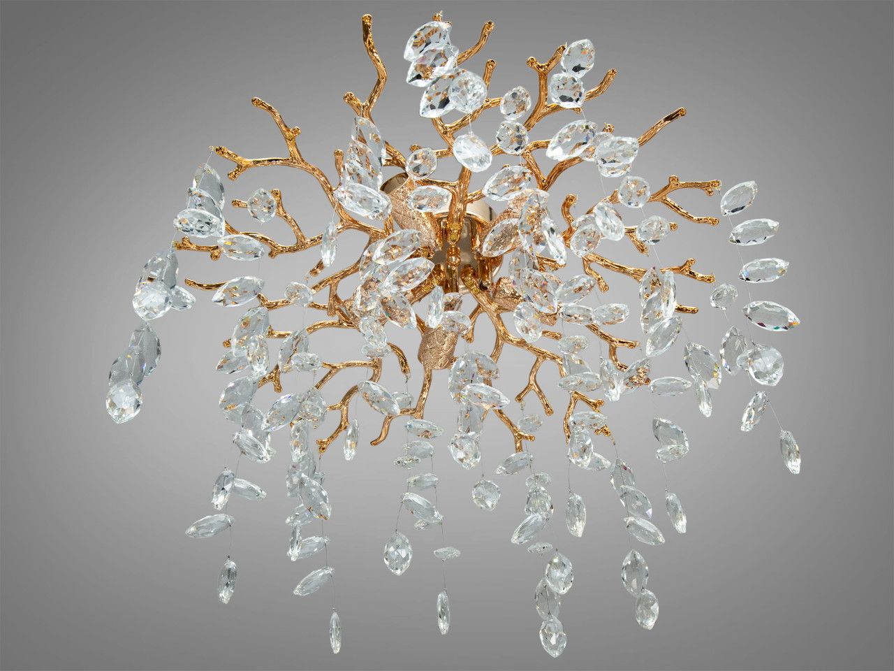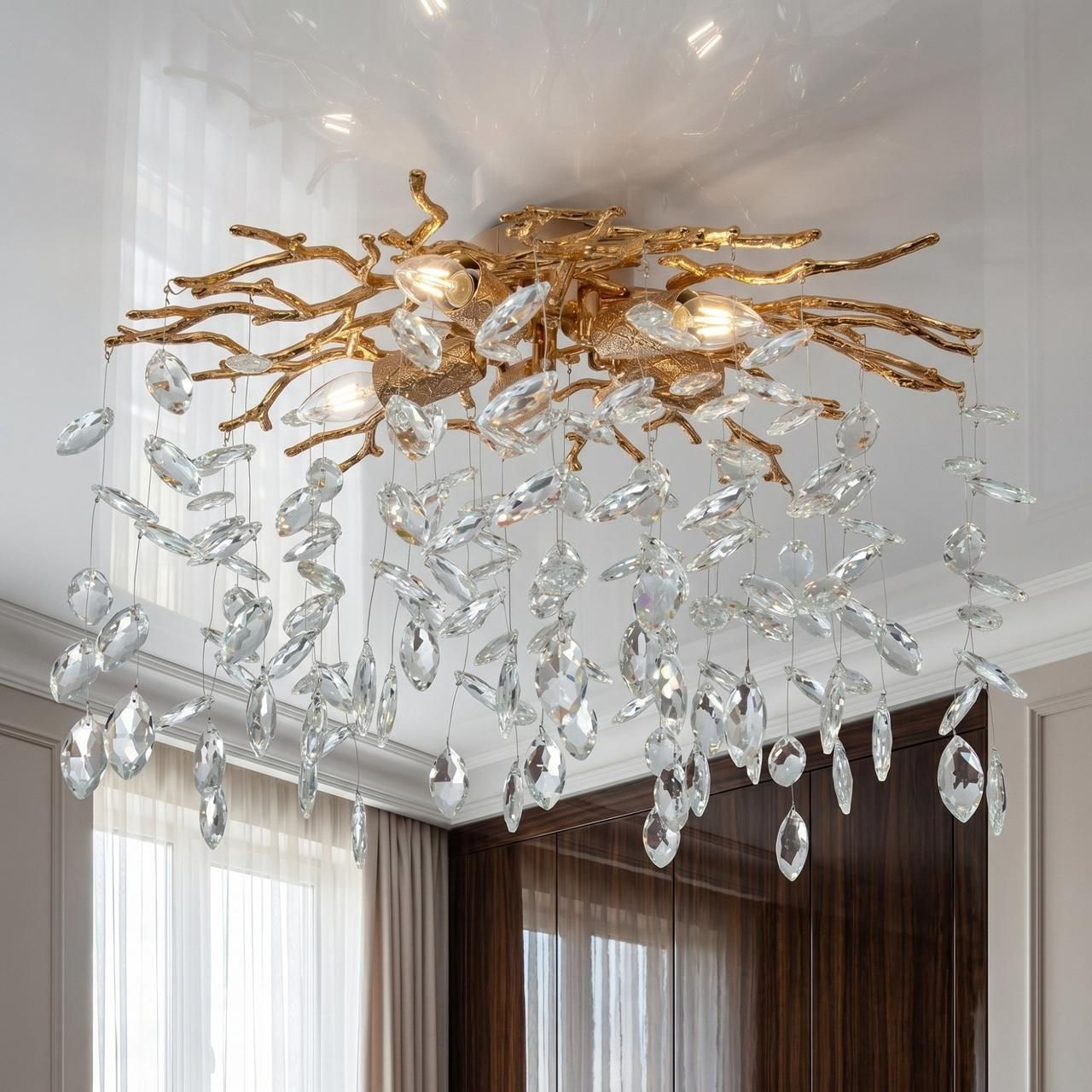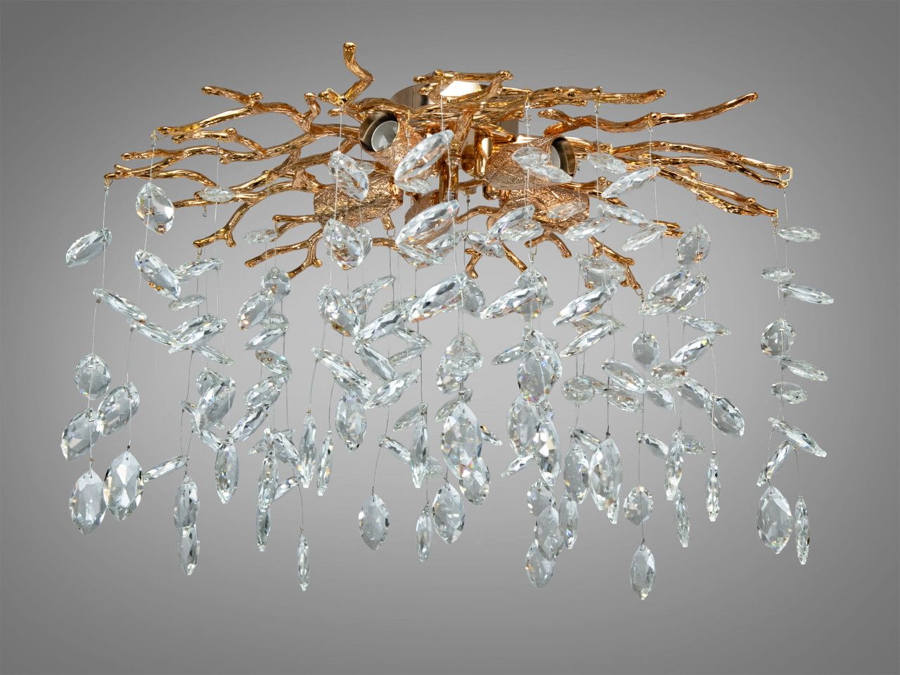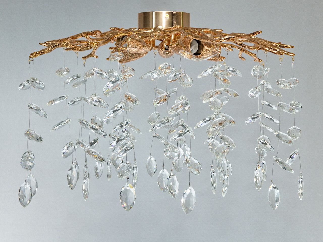 Дизайнерська стельова люстра «Вітка» — Золото-кришталеві краплі