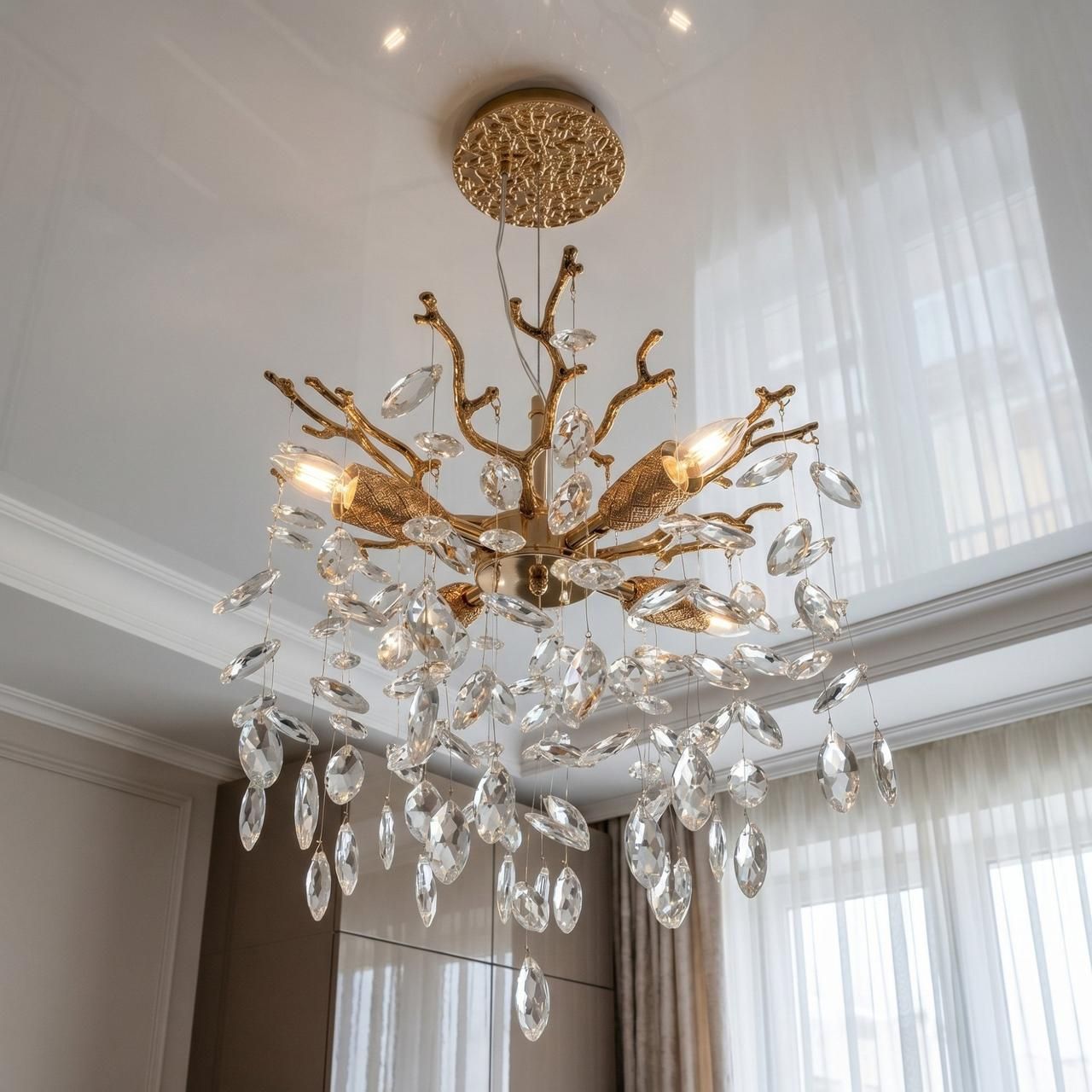 Елегантна підвісна люстра, виготовлена в стилі флористики та сучасного модерну. Модель імітує витончене переплетення золотистих гілок дерева, з яких спадають великі прозорі кришталеві підвіски, що схожі на краплі роси. Завдяки компактному діаметру 40 см і чотирьом джерелам світла, цей світильник стане розкішним акцентом в інтер'єрі спальні, кухні або затишній зоні відпочинку, наповнюючи простір м'яким мерехтінням і природною естетикою.