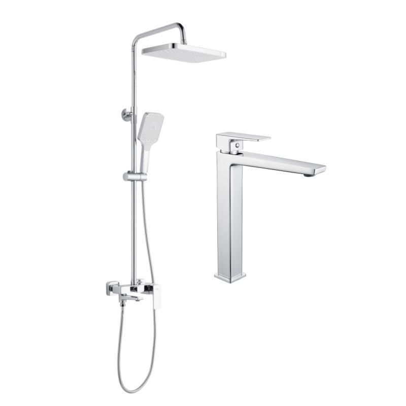 Акційний набір Lidz містить високий латунний змішувач для раковини та душову систему з виливом. Високий змішувач підходить для накладних умивальників, забезпечуючи зручність використання. Латунна конструкція гарантує довговічність, а душова система розширює функціональні можливості ванної кімнати.
