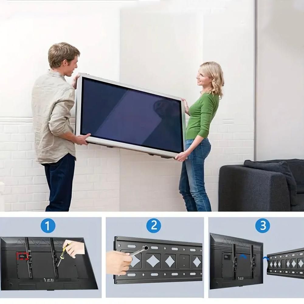 - Цей кронштейн виготовлений із високоякісної сталі, що забезпечує стійкість до навантажень та гарантує безпечне кріплення телевізора навіть за тривалої експлуатації.