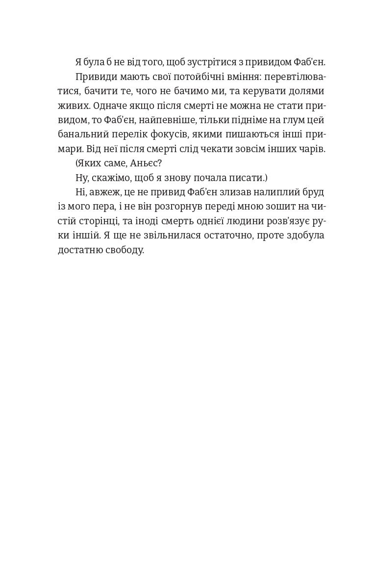 Повертаючись думками до минулого, Аньєс намагається нарешті скласти власну правду — без прикрас, без впливу Фаб’єн, без чужого голосу у своїй голові.
