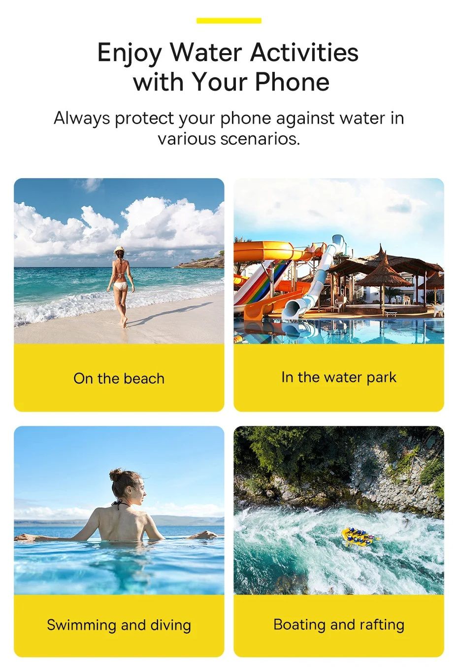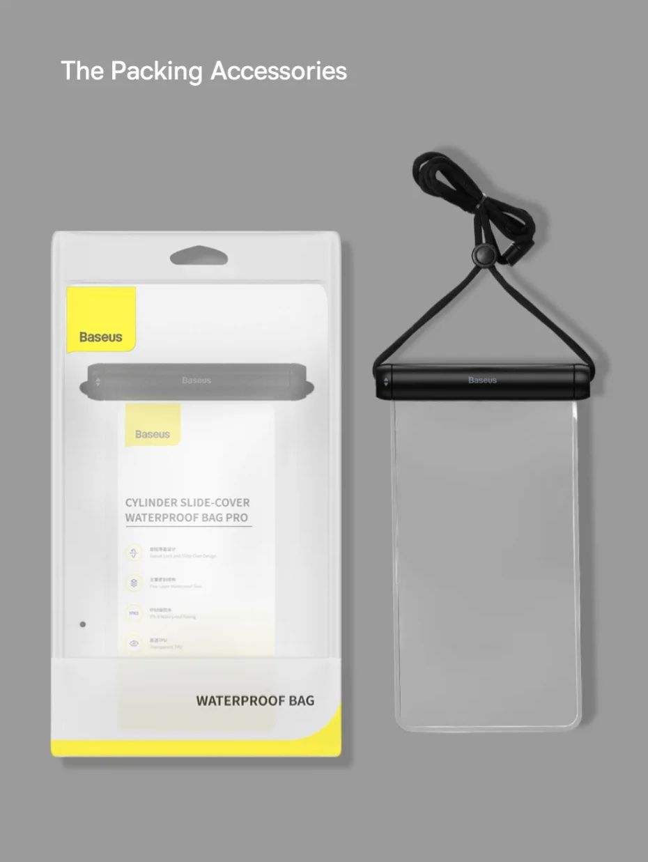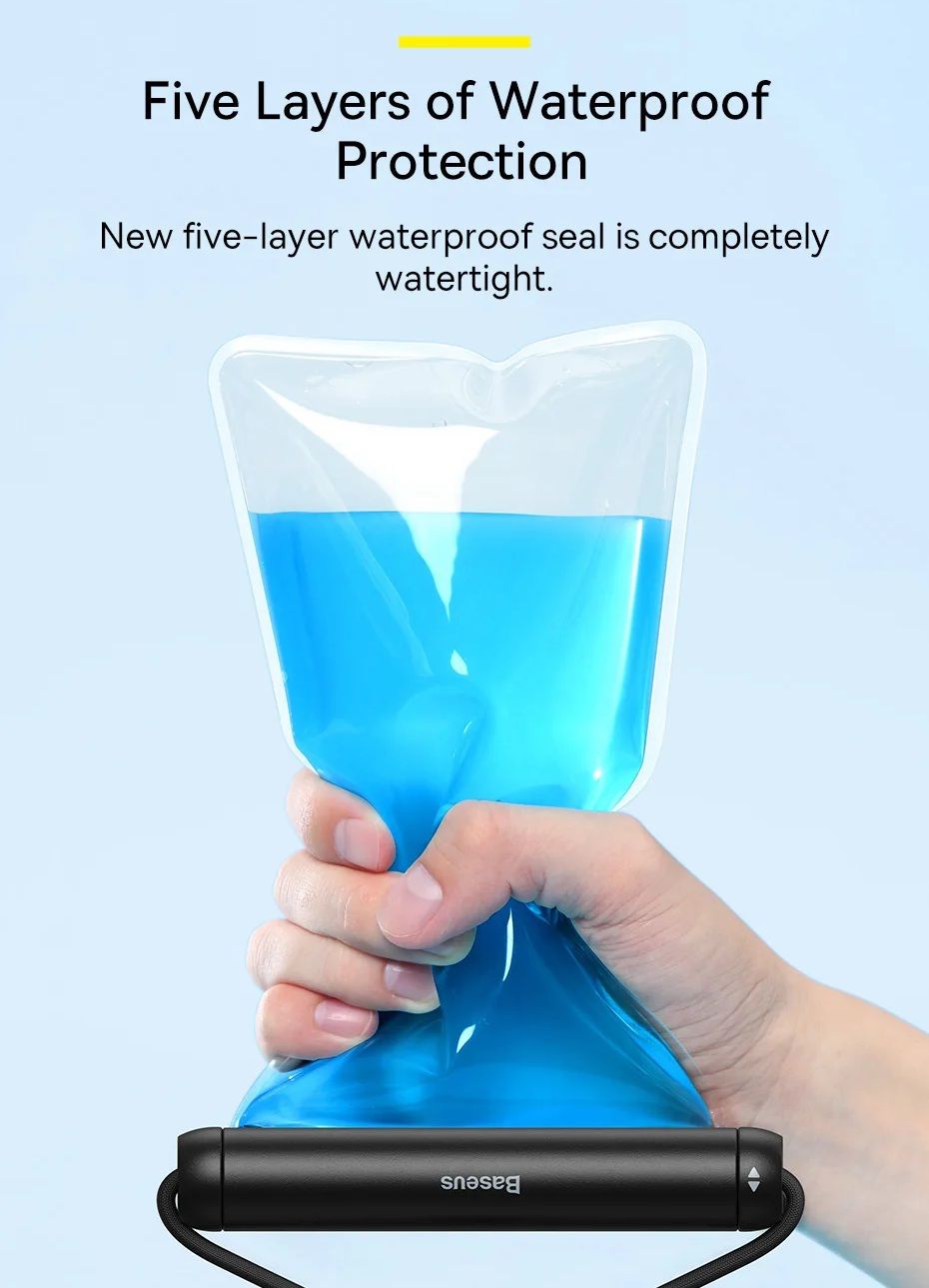 Цей надійний водонепроникний чохол від Baseus призначений для захисту смартфона за будь-яких умов — від повсякденного використання до активного відпочинку на воді. Завдяки багаторівневій системі герметизації та захисту стандарту IPX8 цей чохол забезпечує повну ізоляцію від вологи, пилу та забруднень, зберігаючи при цьому чутливість екрану та можливість використання пристрою.