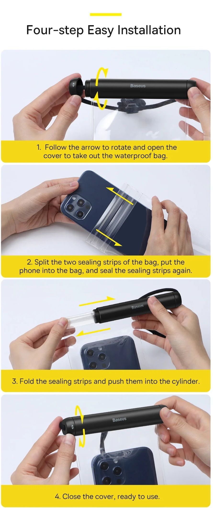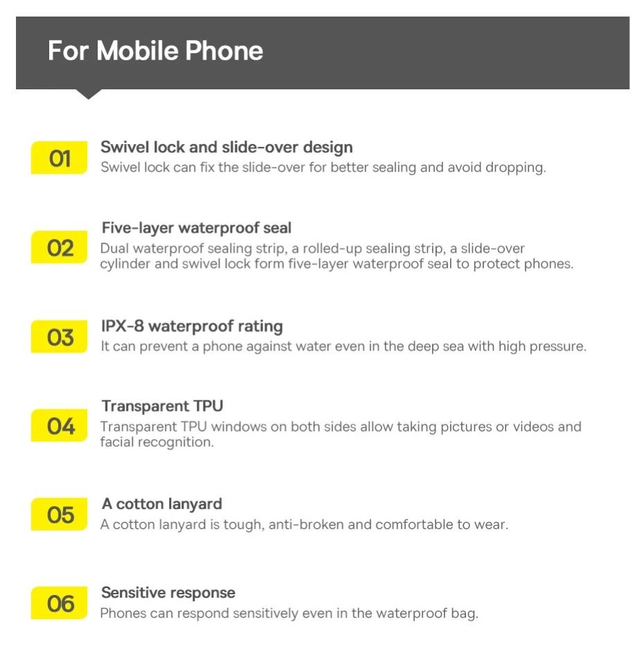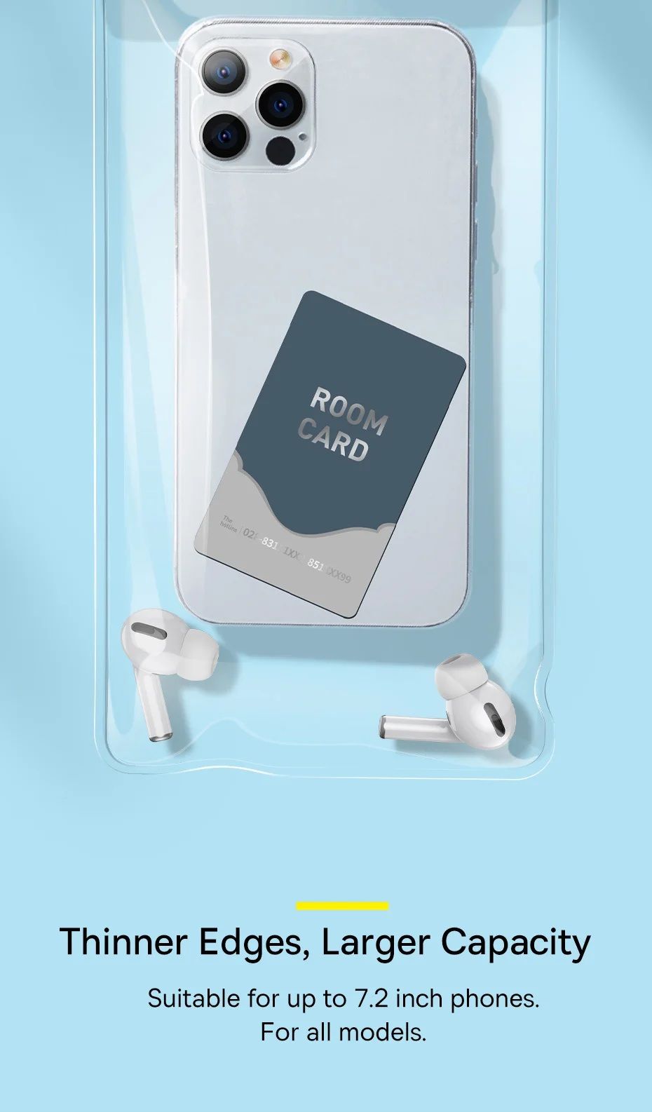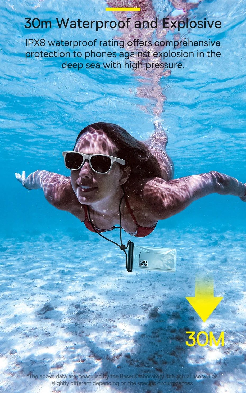 Цей надійний водонепроникний чохол від Baseus призначений для захисту смартфона за будь-яких умов — від повсякденного використання до активного відпочинку на воді. Завдяки багаторівневій системі герметизації та захисту стандарту IPX8 цей чохол забезпечує повну ізоляцію від вологи, пилу та забруднень, зберігаючи при цьому чутливість екрану та можливість використання пристрою.