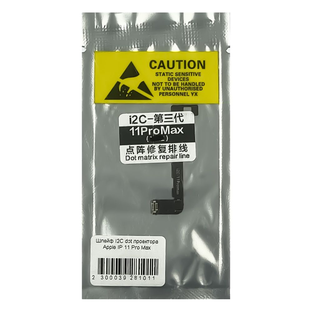 Професійний програмований шлейф від I2C призначений для відновлення працездатності точкового проектора системи Face ID у iPhone 11 Pro Max. Використовується при ремонті та відновленні модуля TrueDepth, дозволяючи коректно перепрограмувати та відновити функцію розпізнавання обличчя без повної заміни дорогого вузла.