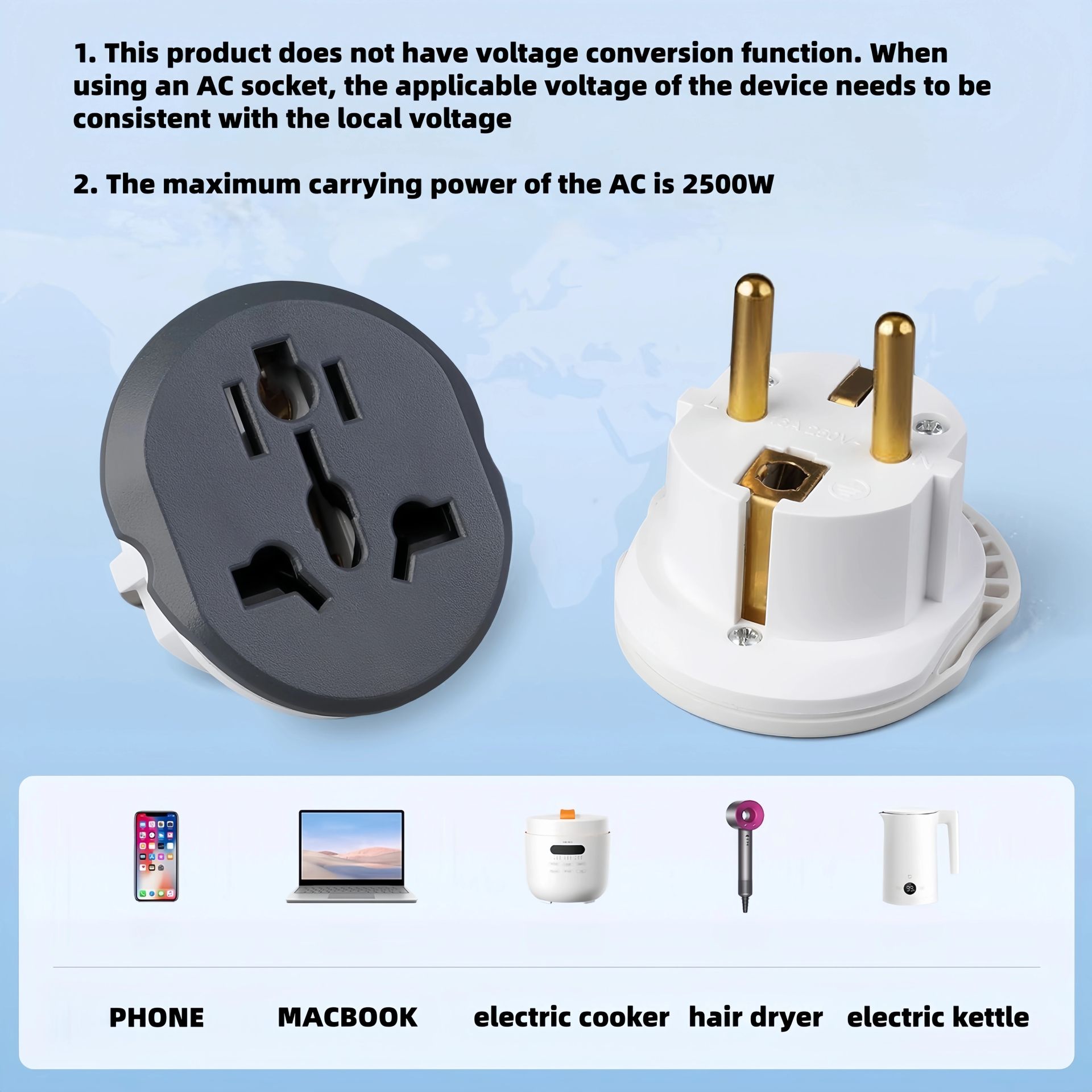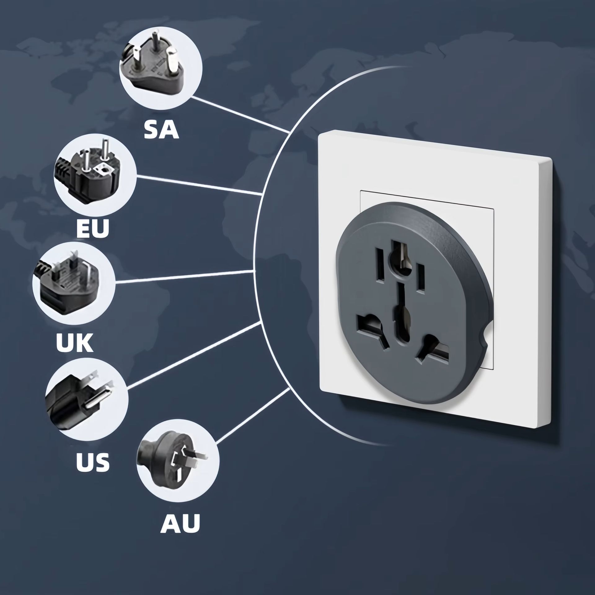 - Підтримує більшість поширених стандартів виделок (європейські, британські, американські, австралійські, південно-африканські), що дозволяє використовувати адаптер у більш ніж 200 країнах світу.