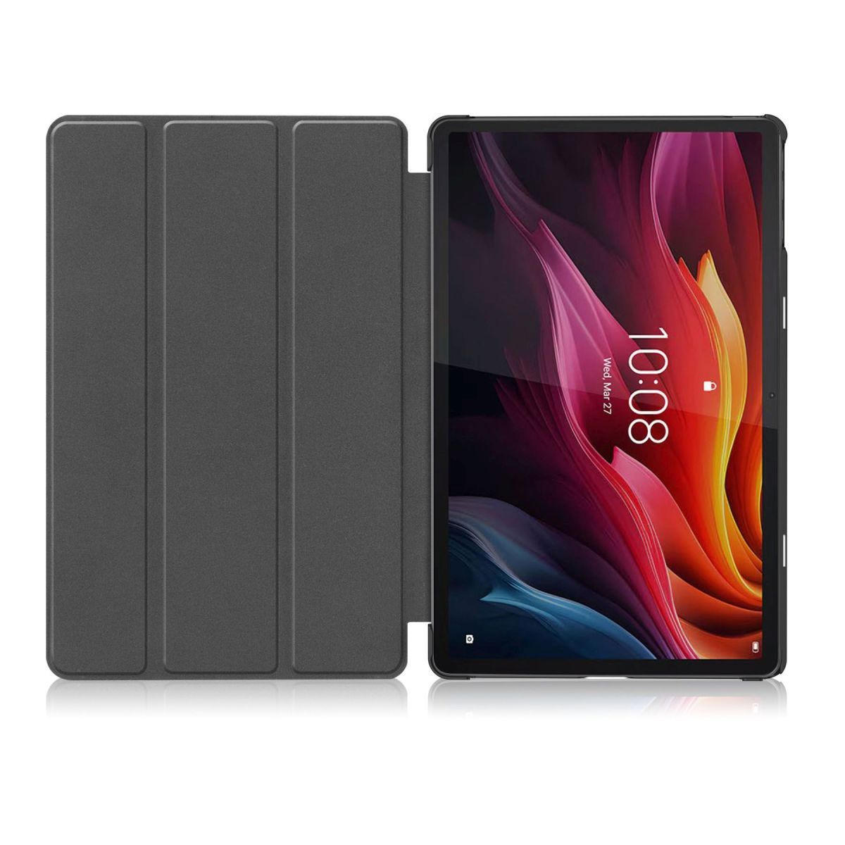 Чохол Lenovo Tab K11 Plus 2025 TB352 зовні обклеєний шкірою пересованої виглядає дуже стильно, а завдяки своїй структурі чітко повторює форму планшета. Пластикова основа чохла, яка замикається на задню частину планшета, зроблена з міцного, але в той же час не товстого пластику. Для того щоб ваш планшет менше піддавався дрібним пошкодженням зсередини, пластик обклеєний мікрофіброю, яка плавно переходить в обкладинку, яка закриває екран. Зовнішній матеріал також цілісним шматком переходить із задньої кришки на передню частину яка закриває екран. Природно зроблений він виключно для Lenovo Tab M11 Plus 11.45", так що всі камери, регулятори, кнопки і отвори будуть легко доступні. Конструкція чохла дозволяє без особливих зусиль перетворити його на підставку, що дуже зручно, коли ви втомилися і хочете просто подивитися фільм. Ви просто складаєте пробіговану передню обкладинку по згинах і ви отримуєте трикутну підніжку Lenovo Tab K11 Плюс TB352FU, а за рахунок вшитих всередину магнітів вона в такому стані тримається дуже міцно. А на додаток до цього є ще одна дуже зручна функція - при закритті чохла екран гасне завдяки спеціальним внутрішнім магнітам.