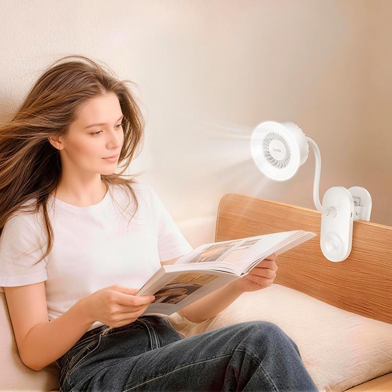 HOCO HX610 Clip Mount Fan – це багатофункціональний пристрій 2-в-1, що поєднує вентилятор та настільну лампу в компактному корпусі з кліпсовим кріпленням. Модель розроблена для комфортного використання вдома, в офісі, під час навчання чи відпочинку, забезпечуючи одночасно охолодження та додаткове освітлення.
