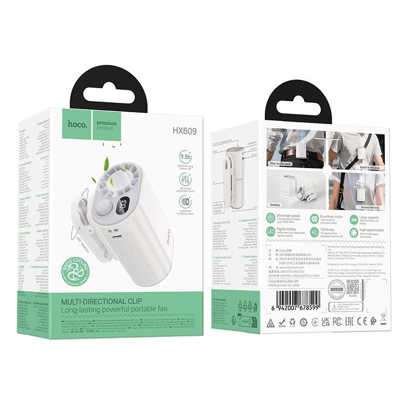HOCO HX609 - це високопродуктивний портативний вентилятор, розроблений для ефективного охолодження за будь-яких умов: вдома, в офісі, на вулиці або в поїздках. Модель поєднує потужний мотор, збільшену автономність та розширені можливості налаштування, забезпечуючи стабільний потік повітря та комфортне використання.