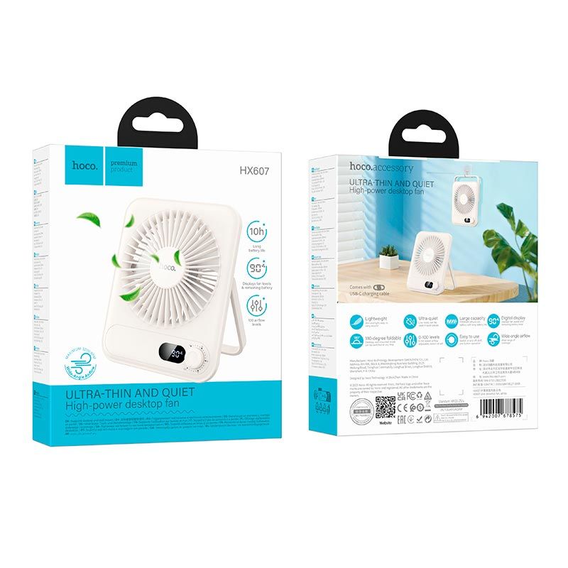 HOCO HX607 Slim Desktop Fan – це сучасний компактний вентилятор у тонкому корпусі, призначений для комфортного охолодження на робочому місці, вдома чи в офісі. Пристрій поєднує стильний мінімалістичний дизайн, тиху роботу і розширені можливості регулювання, забезпечуючи стабільний потік повітря без зайвого шуму.
