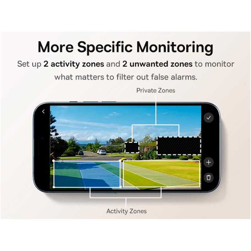 - Система розпізнавання людини та налаштування зон активності дозволяють отримувати повідомлення лише про значущі події, мінімізуючи помилкові спрацьовування.