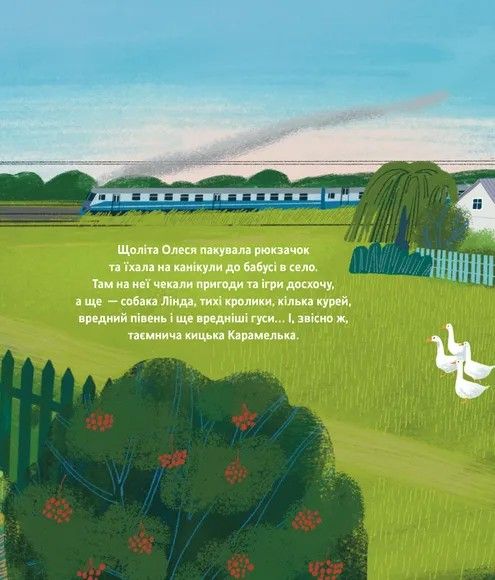 Це тепла, атмосферна історія, у якій звичайне сільське літо раптом наповнюється загадками. Олеся приїздить до бабусі — і потрапляє у світ, де кожен день має свій ритм: ранки з курми та гусьми, денні пригоди серед подвір’я і саду, і вечори… сповнені таємниць.