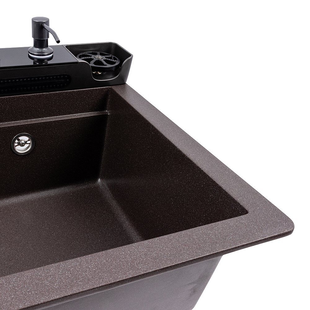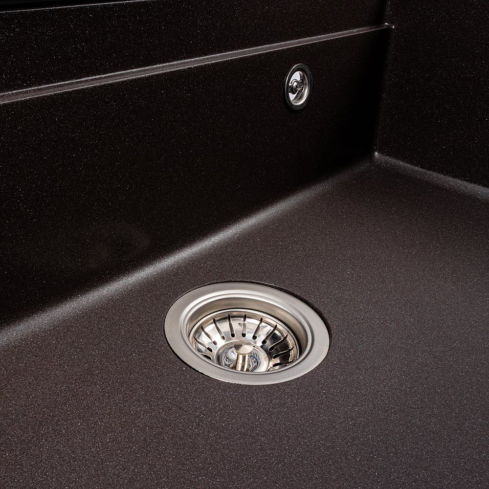 Мийка виготовлена з високоякісного гранітного композиту, що забезпечує стійкість до подряпин, ударів, високих температур і впливу побутової хімії. Вона не вбирає запахи та легко очищується, що робить її практичною у повсякденному використанні.