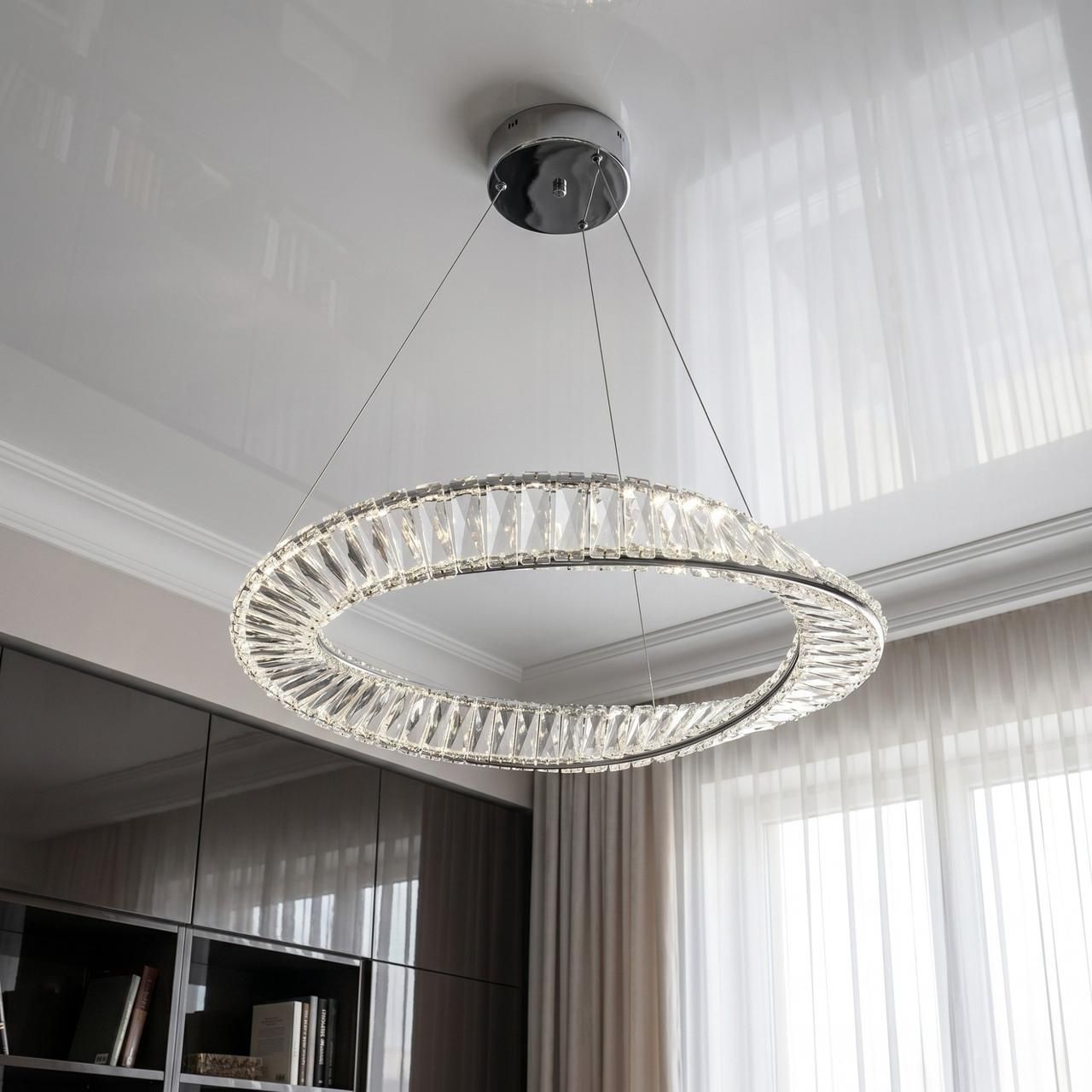 Підвісна світлодіодна люстра діаметром 60 см. Модель потужністю 72 W із декором із прозорого кришталю та дистанційним керуванням призначена для основного освітлення приміщень площею до 16 м².