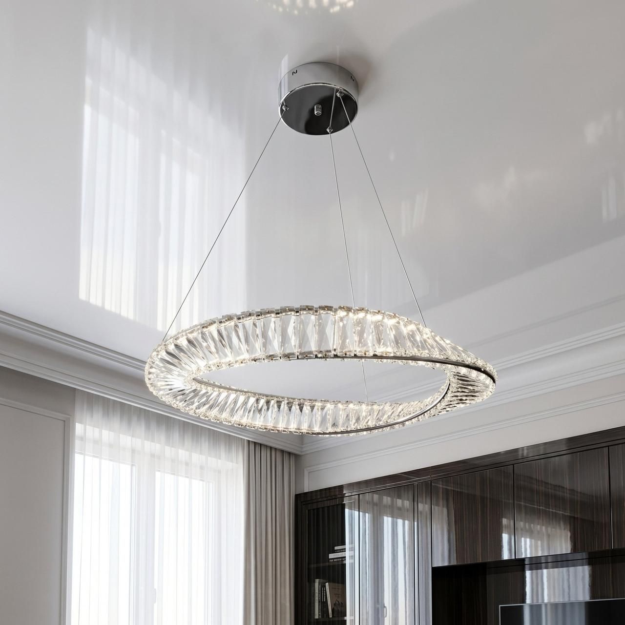 Світильник виконаний у формі динамічного кільця з вигином. Металевий каркас має зносостійке гальванічне покриття кольору хром із дзеркальним блиском. Світловий контур закритий безліччю елементів із прозорого кришталю з геометричним огранюванням. Світло від вбудованих LED-модулів проходить крізь кришталь, рівномірно розподіляючись по простору. Люстра підвішена на системі регульованих тросів, закріплених на круглій основі діаметром 16 см.