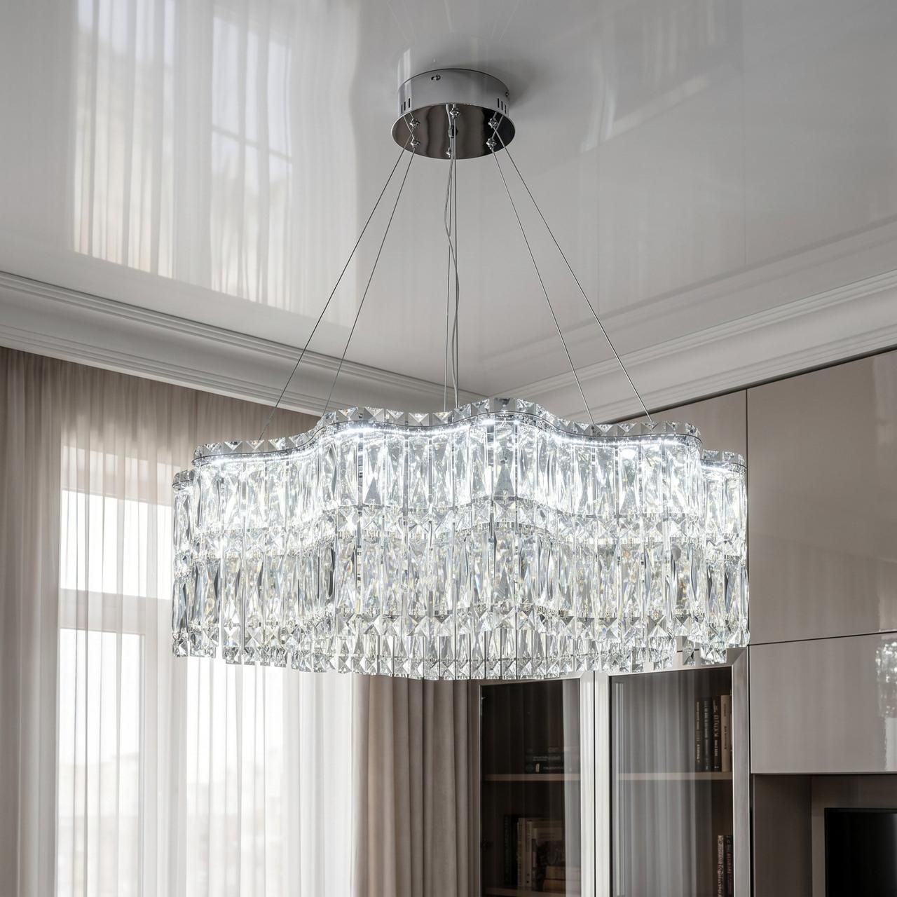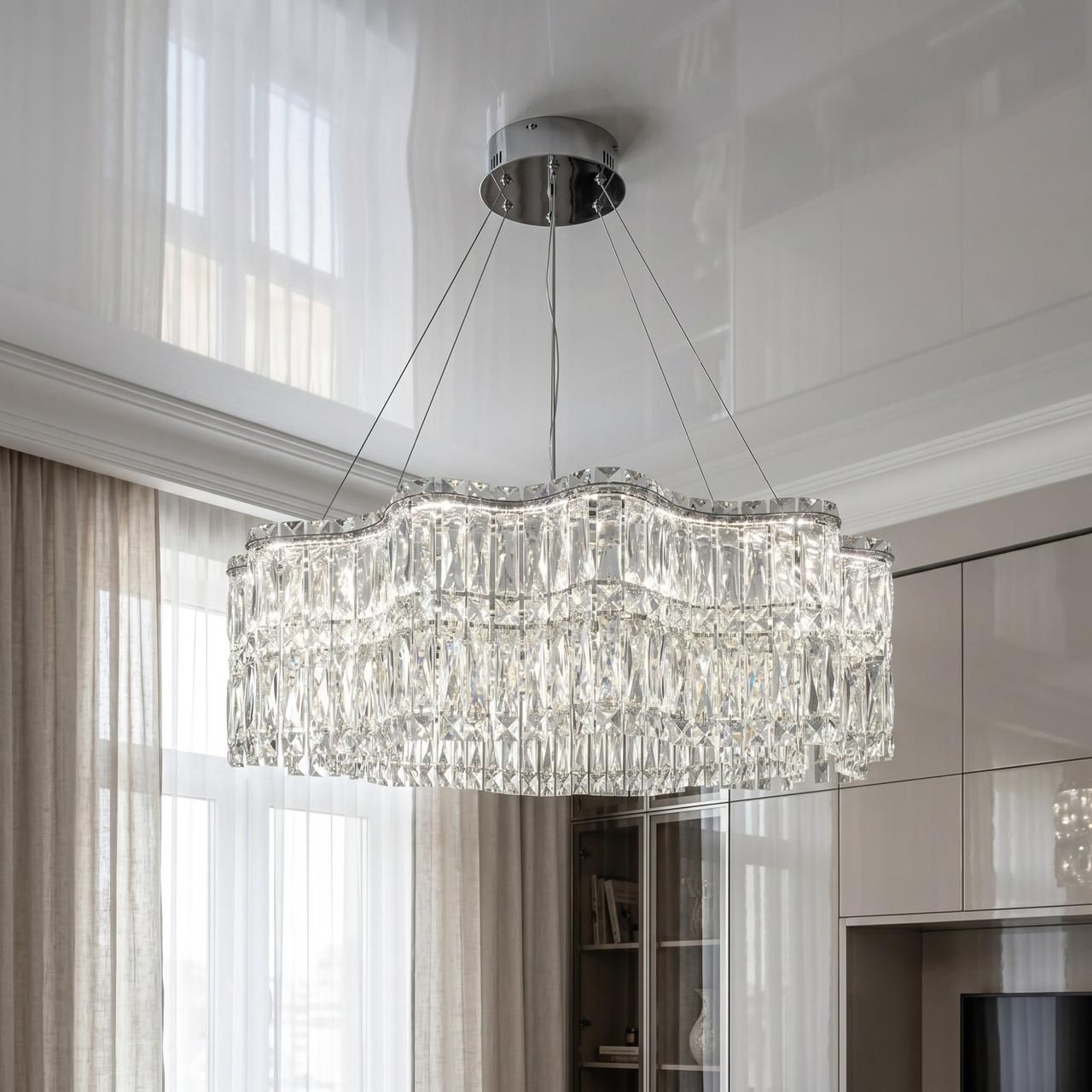 Люстра має кільцевий металевий каркас складної хвилеподібної форми. Поверхня оброблена методом високоякісної гальваніки у кольорі хром із дзеркальним фінішем. Декоративний об'єм формується каскадом прозорих кришталевих елементів прямокутного огранювання, розташованих у кілька рядів. Світло від вбудованих LED-модулів проходить крізь кришталь, забезпечуючи рівномірне заломлення та відсутність засліплюючого ефекту. Система підвісу дозволяє регулювати висоту виробу.