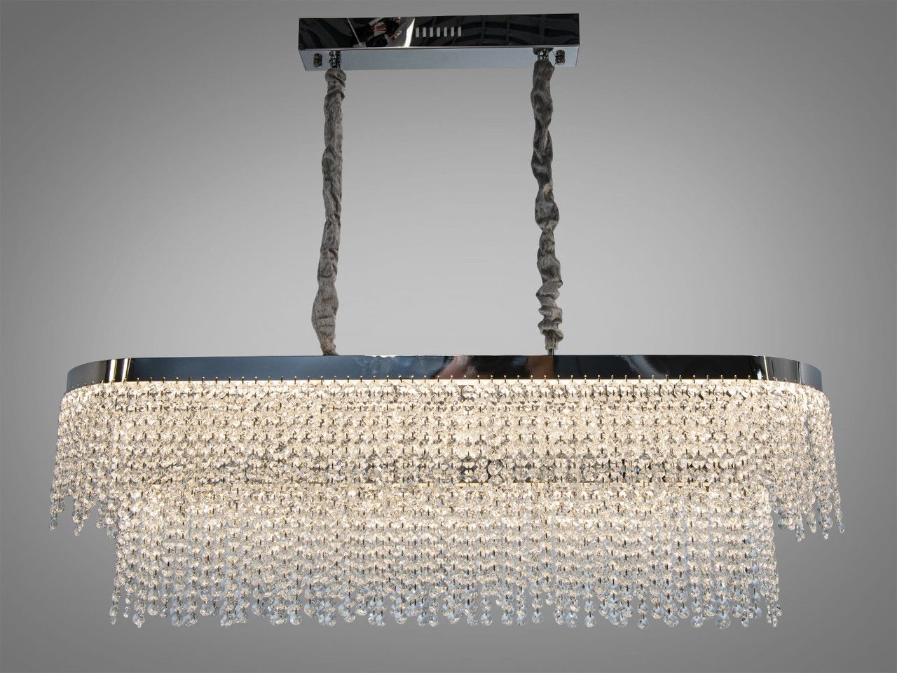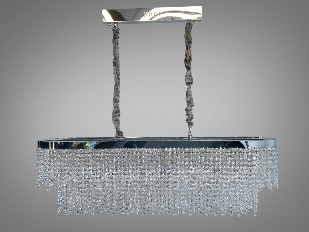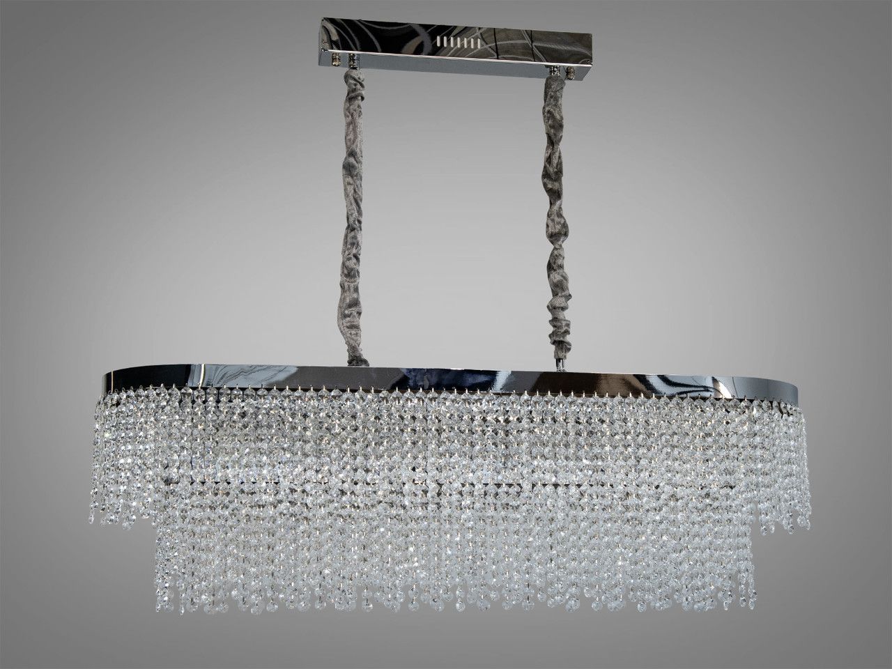 Світильник має витягнуту овальну форму. Металевий каркас оброблений методом гальванічного напилення у кольорі хром із дзеркальним ефектом. Декоративна частина складається з щільного каскаду прозорих кришталевих підвісок, розташованих у кілька ярусів. Світло від потужних вбудованих LED-модулів проходить крізь грані кристалів, забезпечуючи яскраве та рівномірне освітлення без темних зон. Люстра підвішена на двох регульованих підвісах у текстильних чохлах, що закріплені на довгій основі (40 см).
