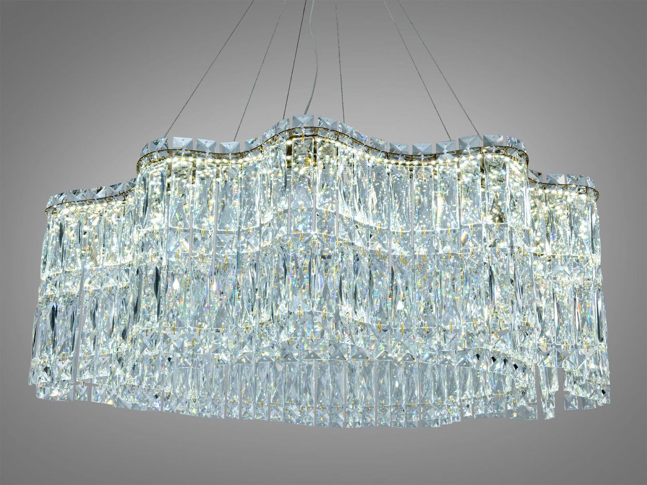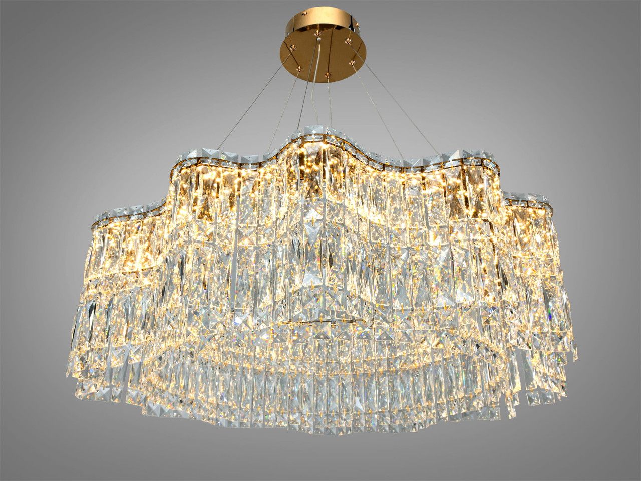 Люстра має кільцевий металевий каркас складної хвилеподібної форми. Поверхня оброблена методом високоякісної гальваніки у кольорі золото з дзеркальним фінішем. Декоративний об'єм формується каскадом прозорих кришталевих елементів прямокутного огранювання, розташованих у кілька рядів. Світло від вбудованих LED-модулів проходить крізь кришталь, забезпечуючи рівномірне заломлення та відсутність засліплюючого ефекту. Система підвісу дозволяє регулювати висоту виробу.