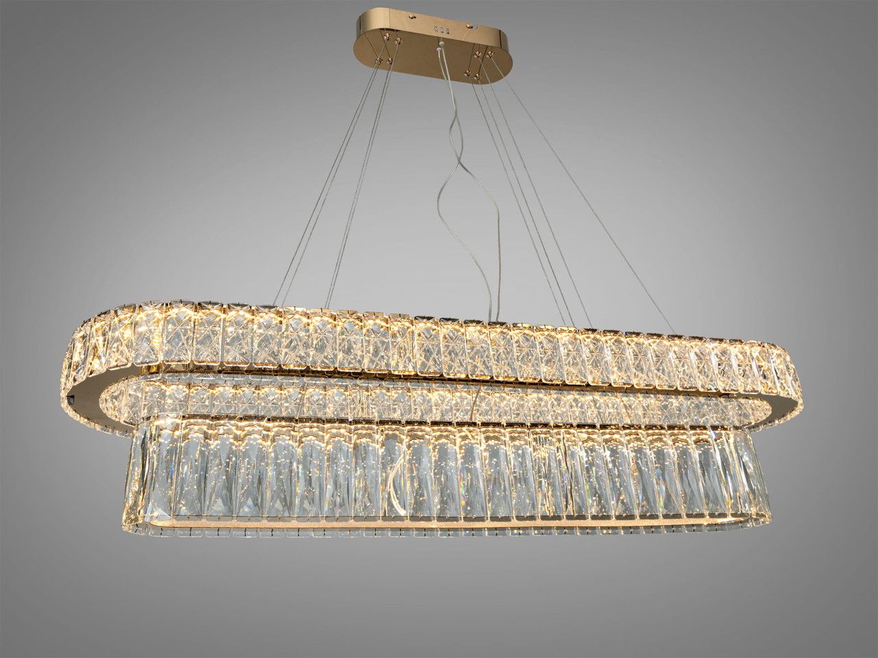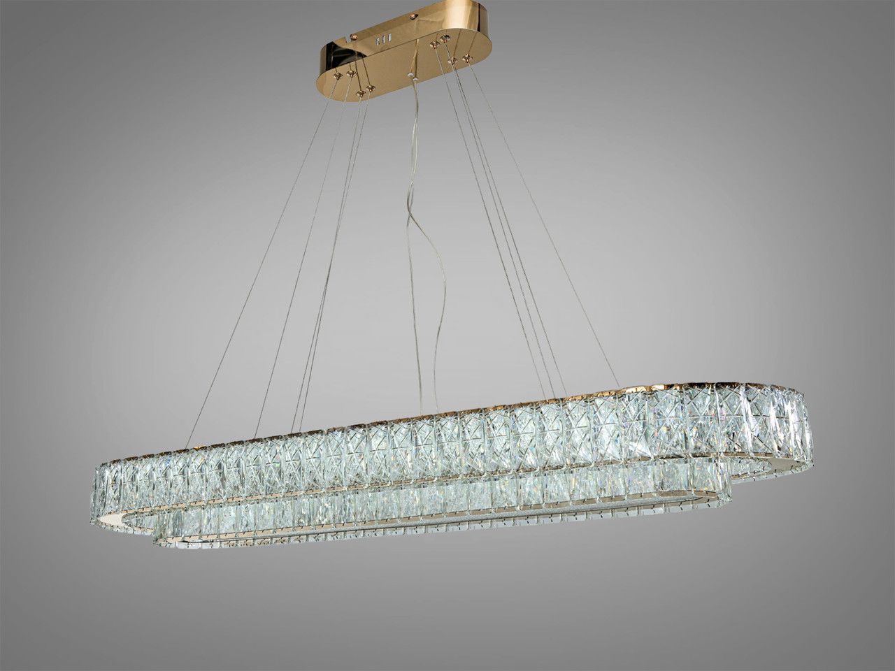 Світильник має витягнуту горизонтальну форму. Металевий каркас оброблений методом гальванічного напилення у кольорі золото з дзеркальним ефектом. Декоративна частина складається з двох ярусів прозорих кришталевих підвісок різної довжини. Кристали мають складне огранювання, що забезпечує ефективне заломлення світла від вбудованих LED-модулів. Люстра підвішена на сталевих тросах до прямокутної основи завдовжки 28 см. Загальна висота приладу регулюється за рахунок зміни довжини підвісів.