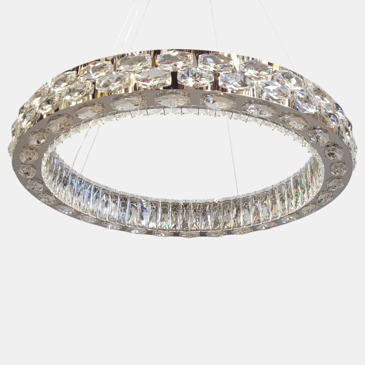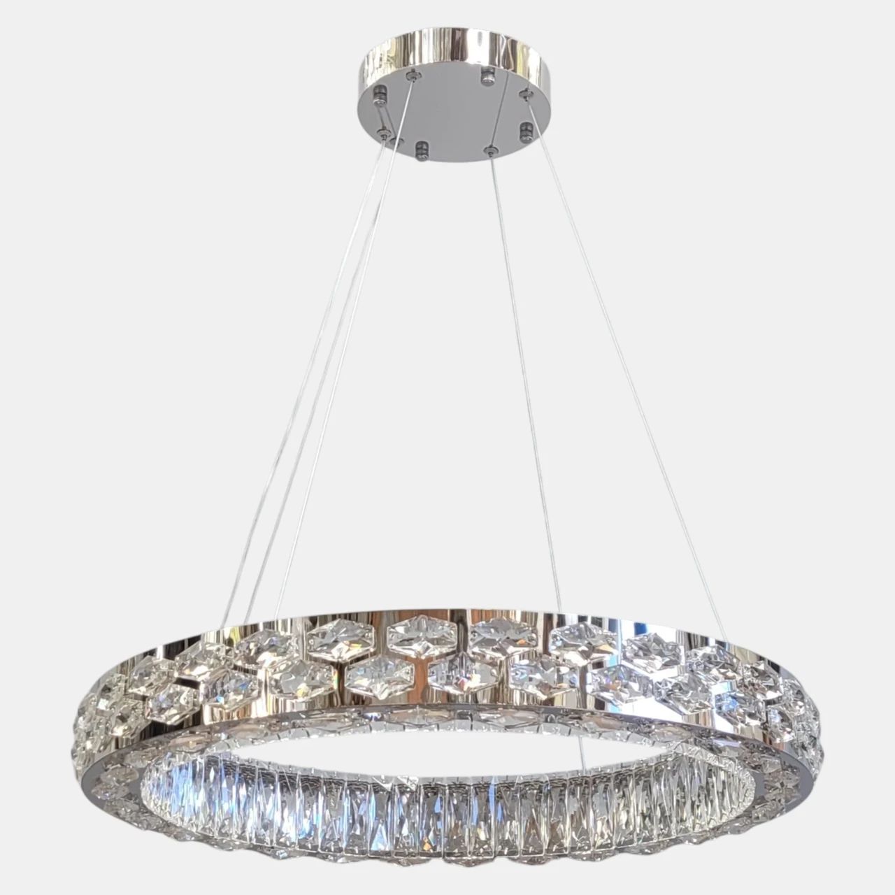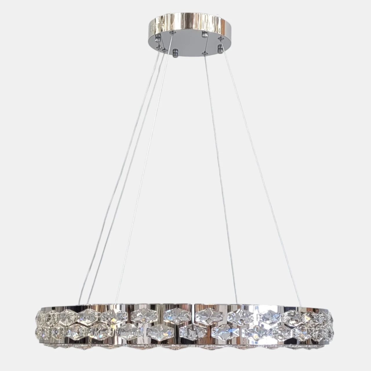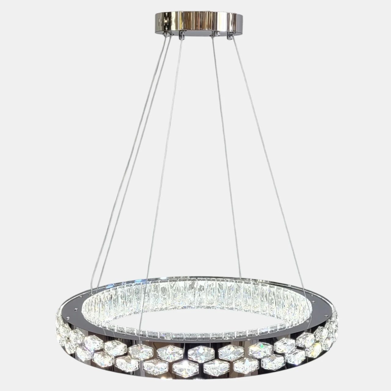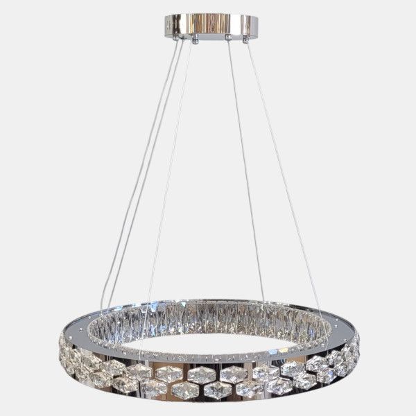Люстра виконана у формі підвісного кільця. Металевий каркас має зносостійке гальванічне покриття кольору хром із дзеркальним ефектом. Вздовж усього периметра кільця розташовані вставки з прозорого кришталю з геометричним огранюванням. Світло від вбудованих світлодіодних модулів проходить крізь кришталь, рівномірно розсіюючись по простору. Система підвісу складається зі сталевих тросів, довжину яких можна регулювати для налаштування висоти або кута нахилу конструкції.