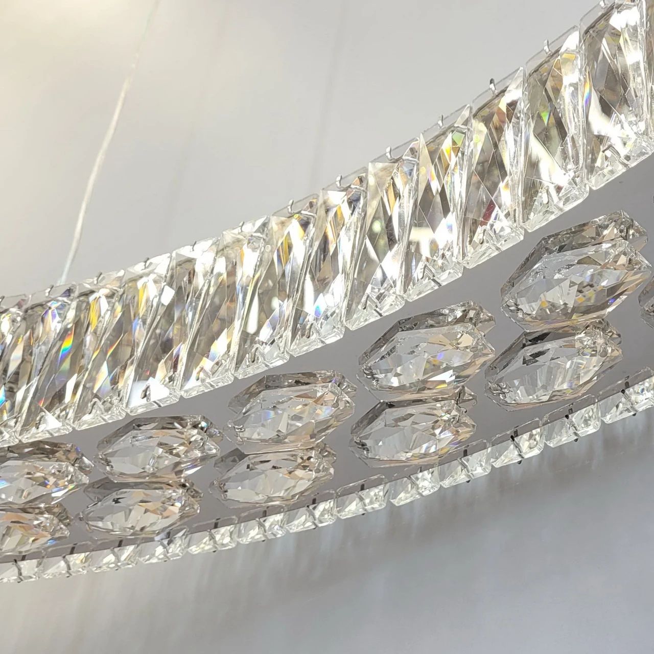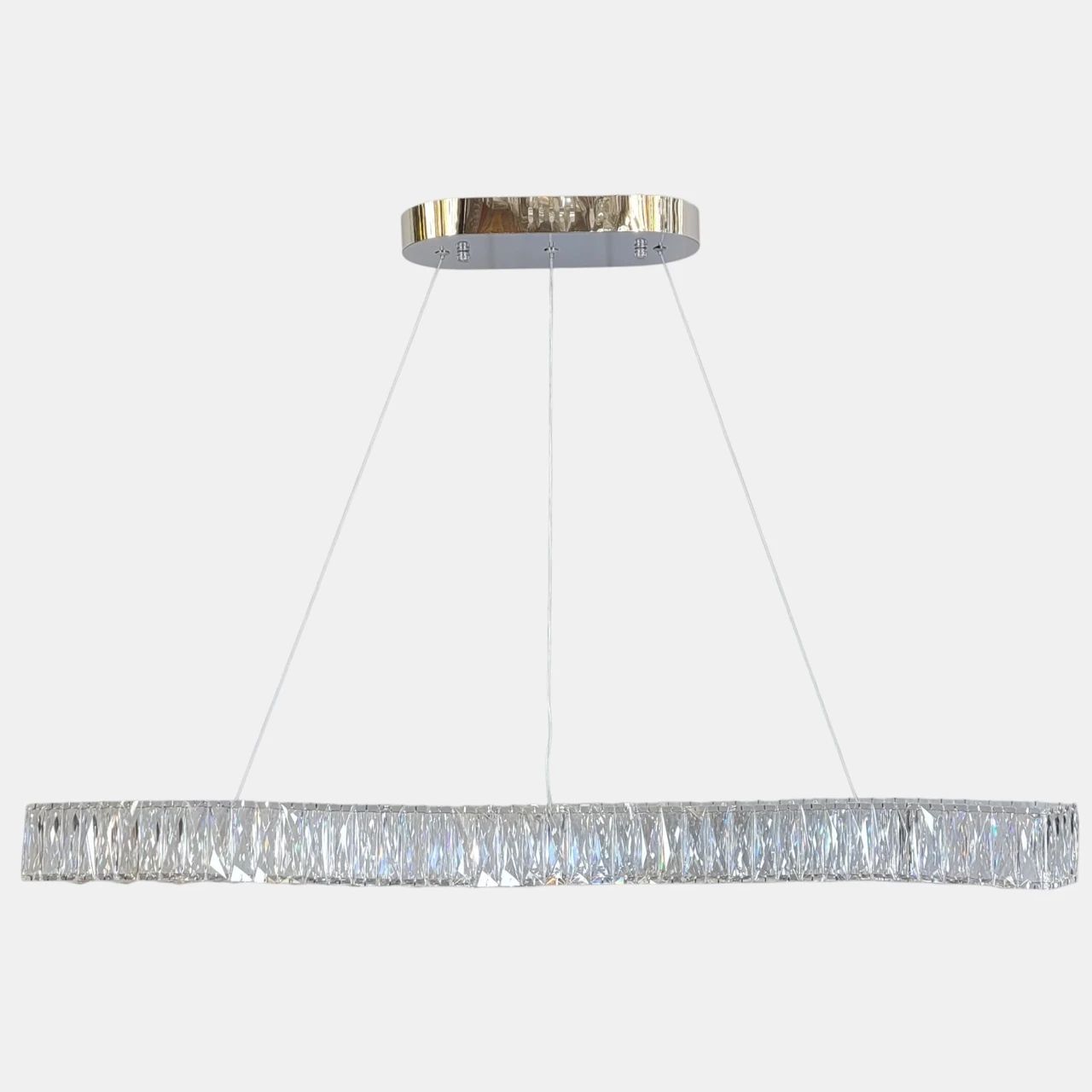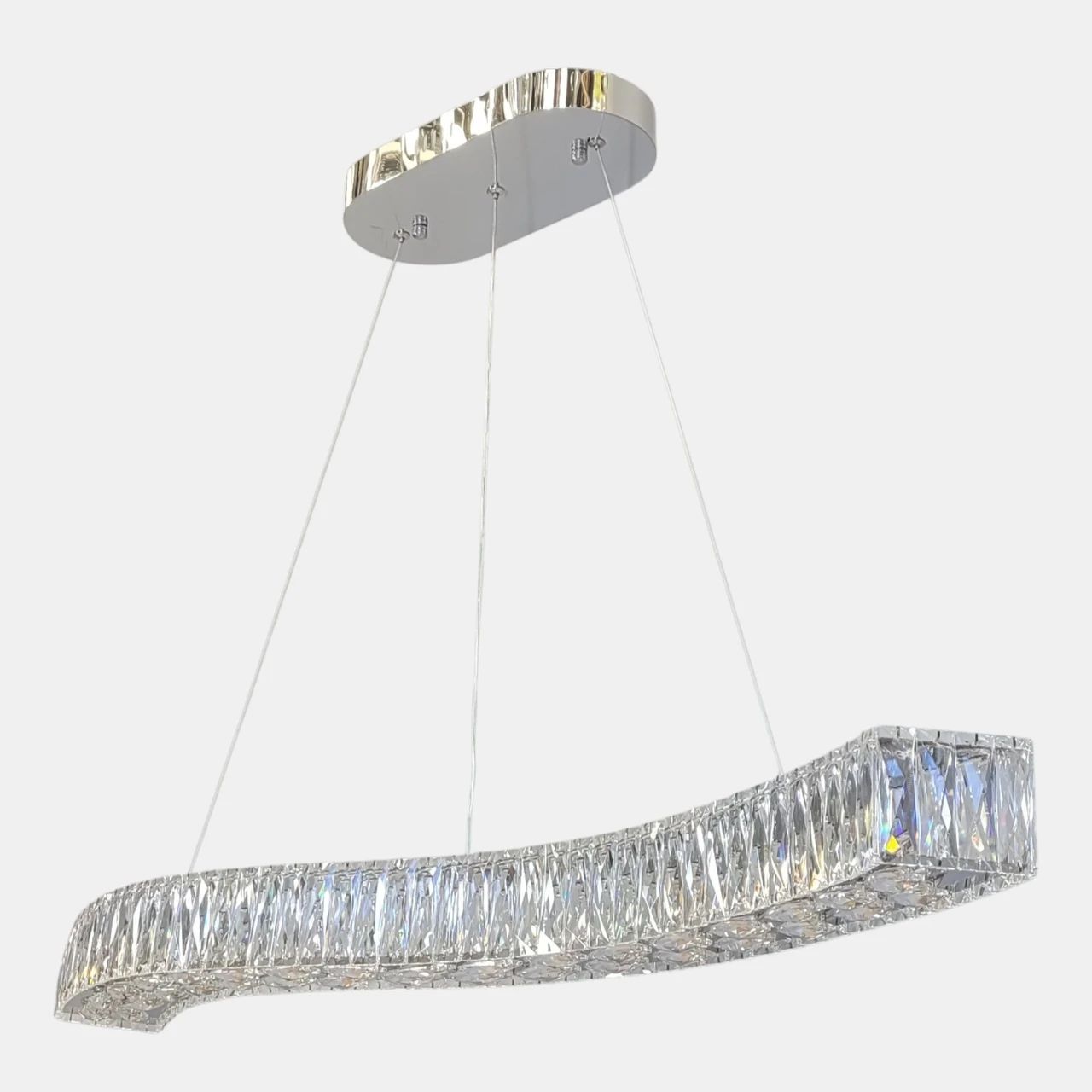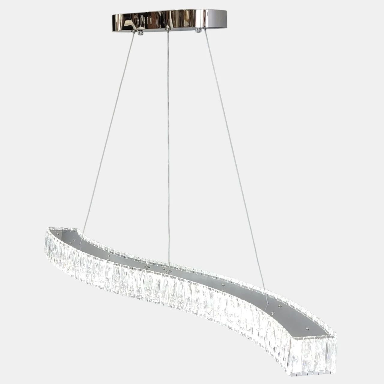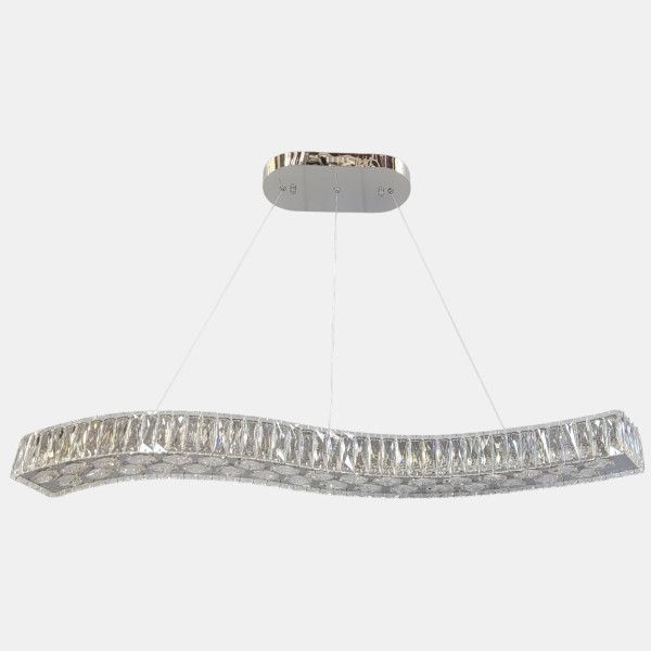 Конструкція люстри являє собою витончений металевий профіль, вигнутий у формі плавної хвилі. Каркас оброблений методом високоякісної гальваніки у кольорі хром, що забезпечує ідеальний дзеркальний блиск. Нижня та бічні грані корпусу густо декоровані прямокутними елементами з прозорого кришталю. При ввімкненні світло від вбудованих LED-модулів проходить крізь грані кристалів, створюючи на стінах та стелі живий малюнок із відблисків. Люстра підвішена на тонких регульованих тросах, які дозволяють налаштувати висоту до 140 см.