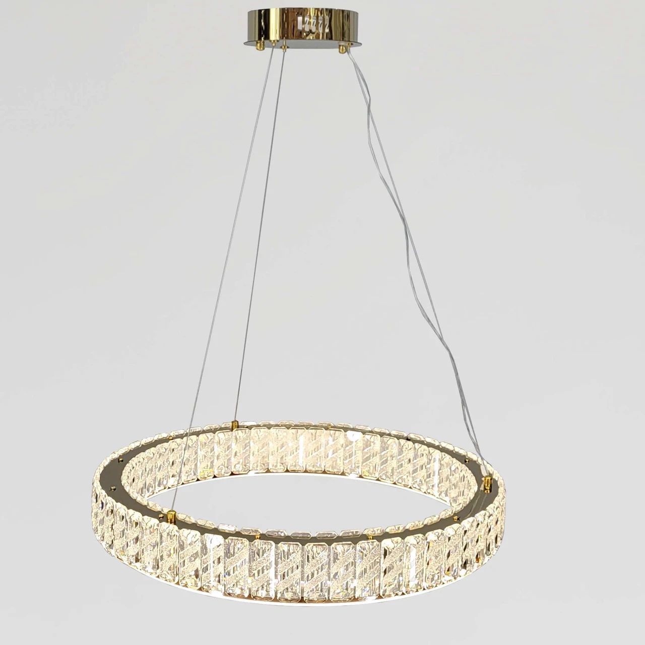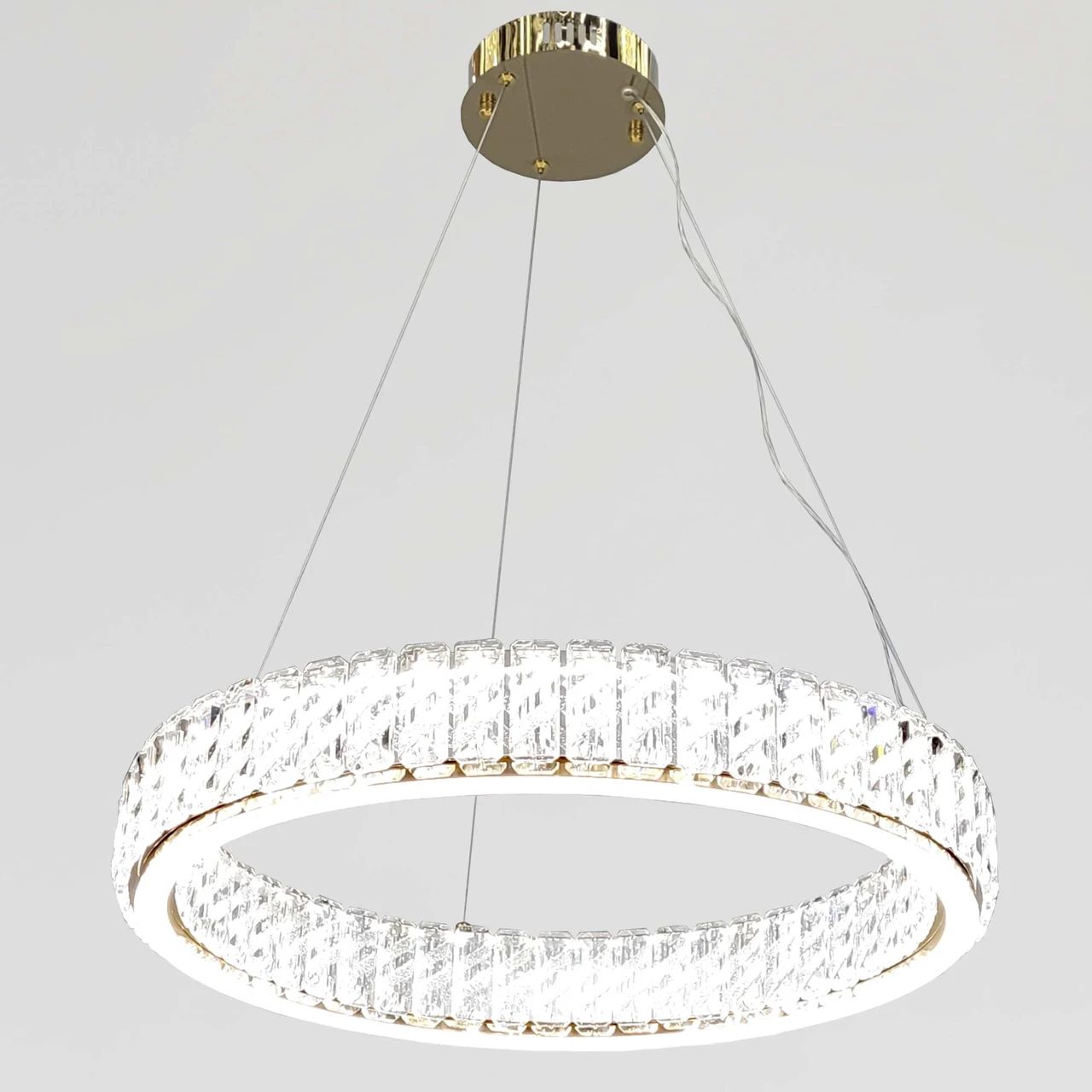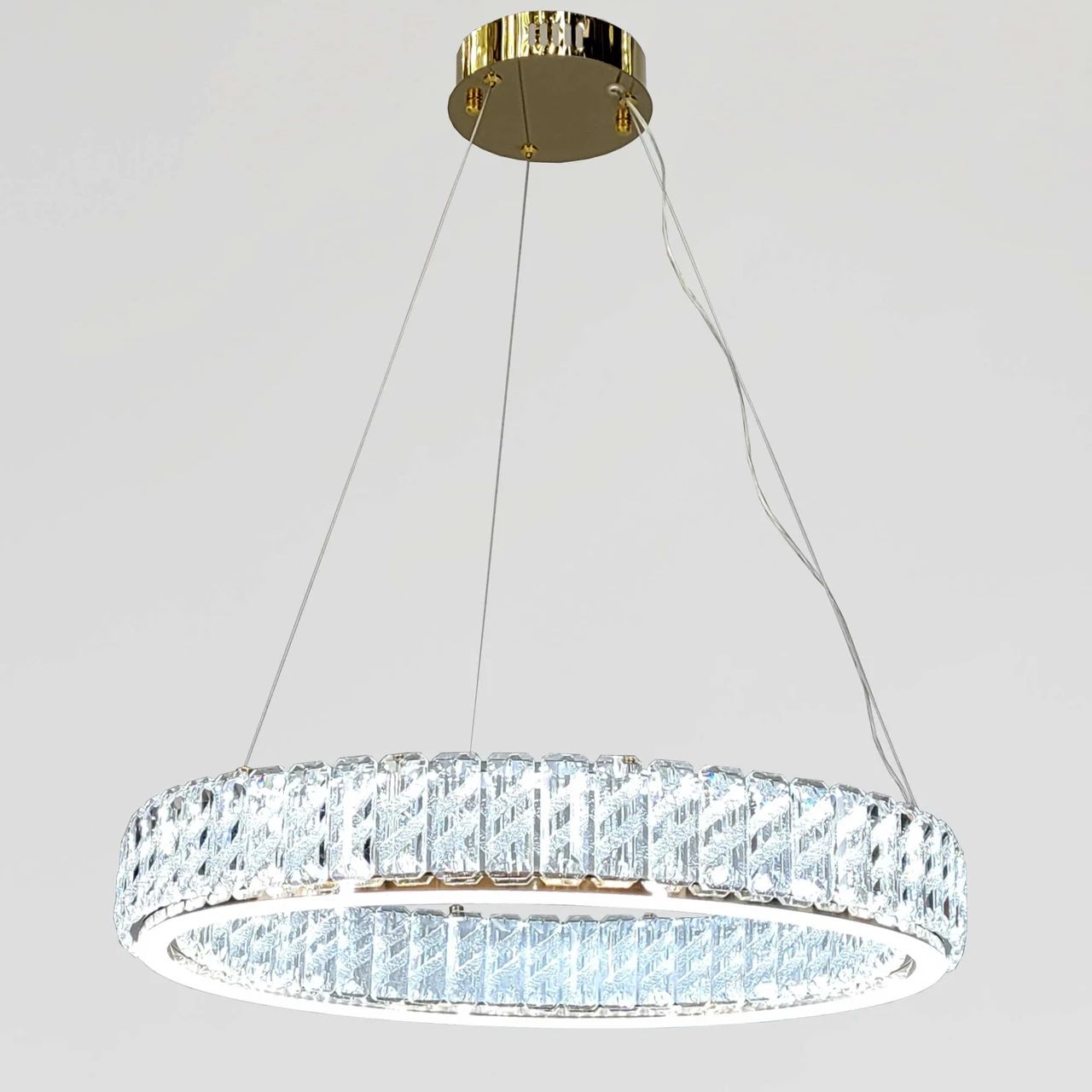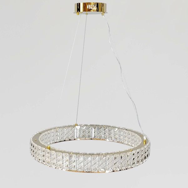 Основою світильника є кільце діаметром 58 см, що ніби ширяє в повітрі. Металевий каркас оброблений методом високоякісної гальваніки у кольорі золото, що надає виробу дзеркального блиску та стійкості до корозії. Вздовж усього периметра кільця розташовані масивні кришталеві елементи зі складним огранюванням. При ввімкненні світло від вбудованих LED-модулів проходить крізь кришталь, багаторазово заломлюючись і створюючи на стінах і стелі живі іскристі відблиски. Люстра підвішена на системі тонких регульованих тросів, що дозволяють легко змінювати висоту та нахил кільця.