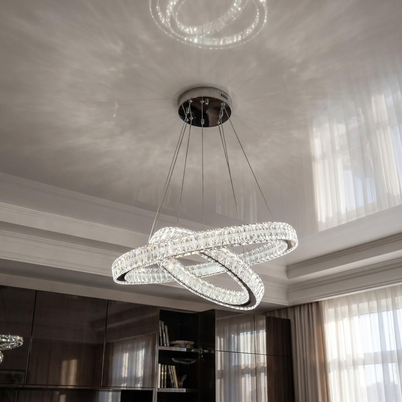Регульований підвіс: Висота налаштовується індивідуально для кожного кільця, що дозволяє адаптувати люстру під висоту стелі.