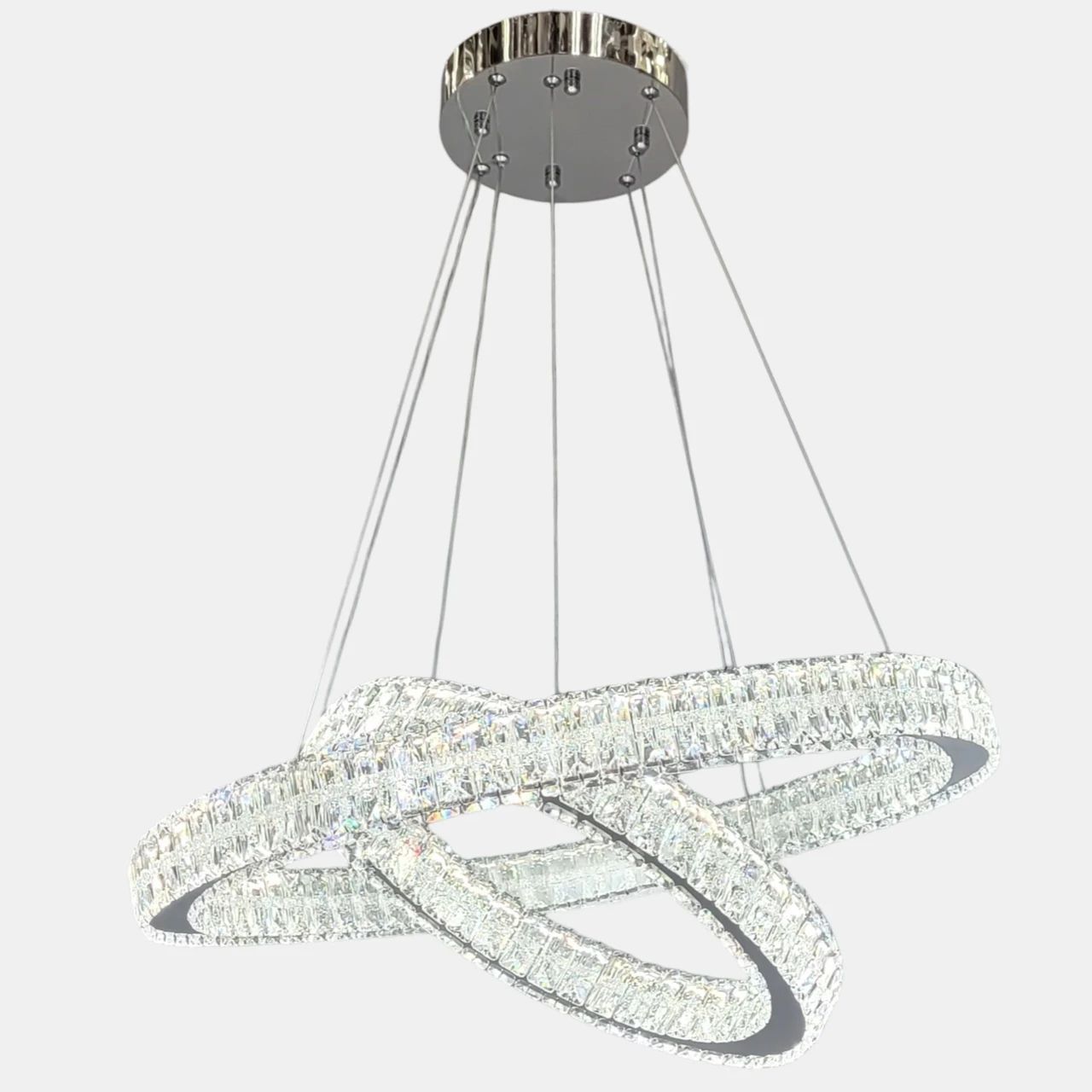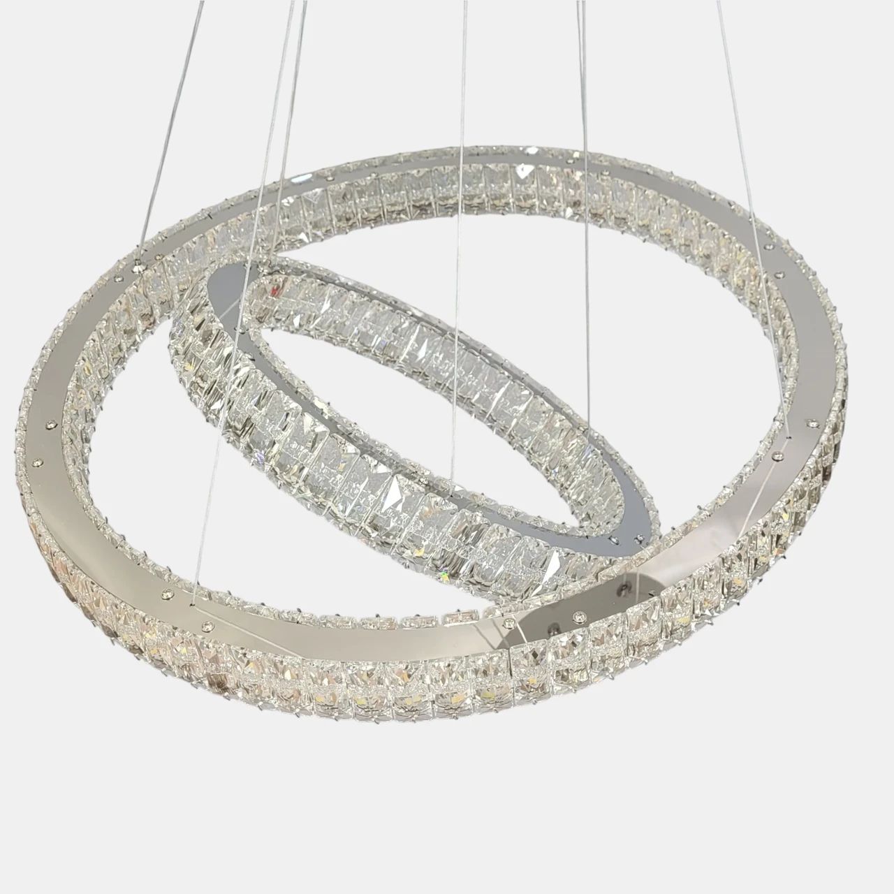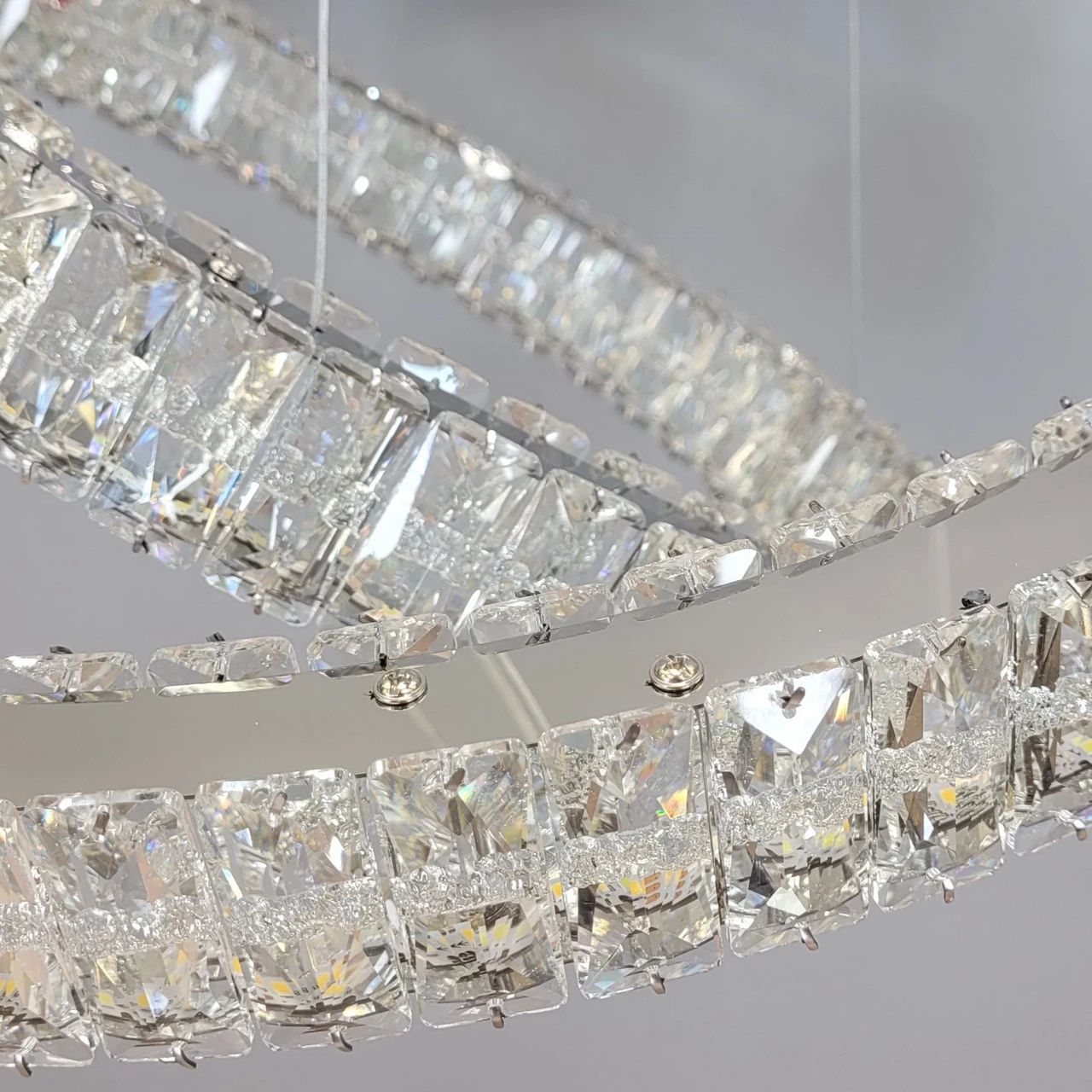 Конструкція складається з двох незалежних світлових кілець діаметром 59.5 см та 39.5 см. Металевий каркас має дзеркальне гальванічне покриття кольору хром. Зовнішня та внутрішня сторони кожного кільця декоровані вставками з прозорого кришталю з геометричним огранюванням. Світло від вбудованих LED-модулів проходить крізь грані кристалів, забезпечуючи рівномірне заповнення простору. Система підвісу на сталевих тросах дозволяє регулювати загальну висоту приладу до 129 см та змінювати положення кілець (паралельно або під кутом).