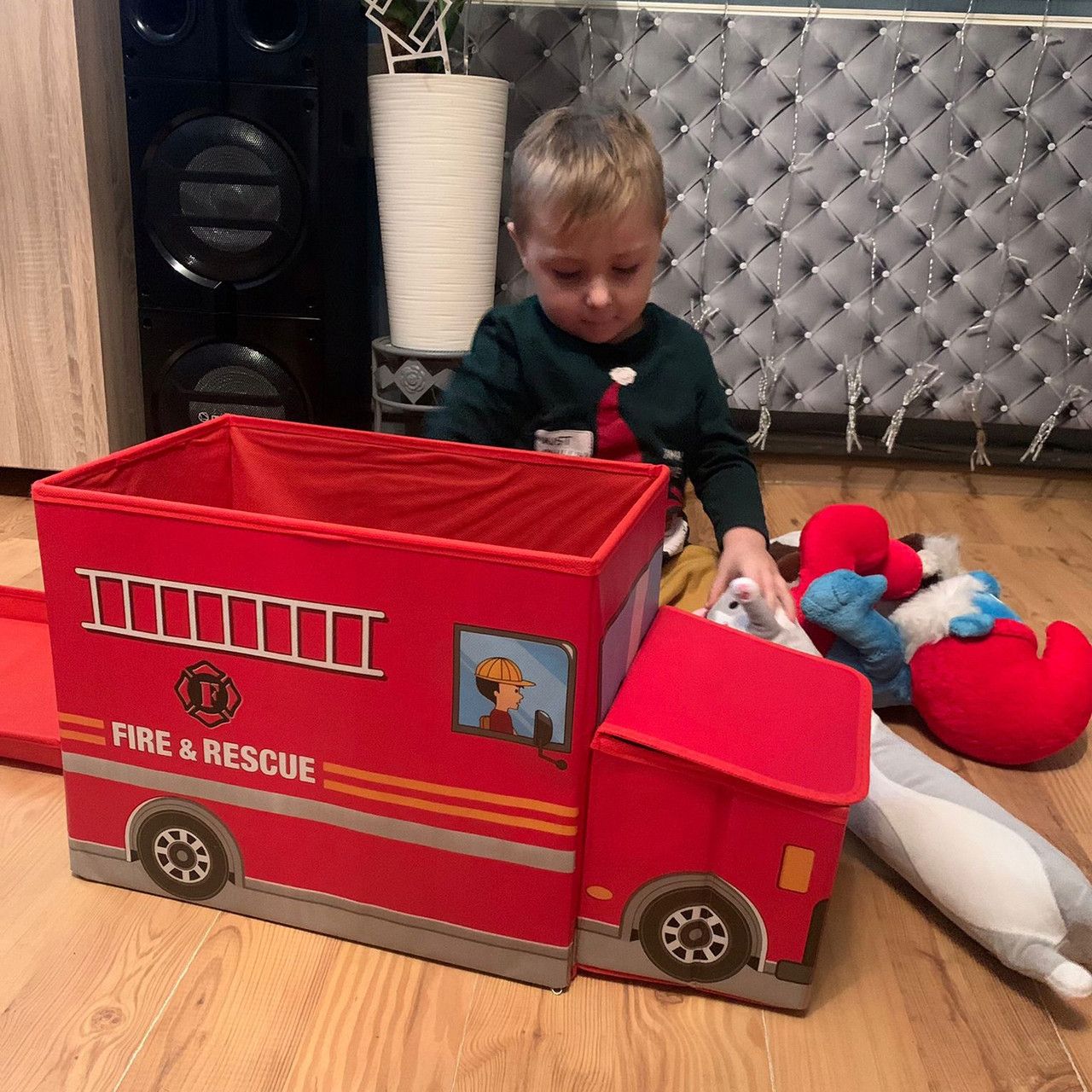 - Пожежна машина - Ця іграшкова коробка, що замикається, є макетом пожежної станції; будь-який шанувальник пожежної машини буде в захваті від такого подарунка. Це практичний гаджет, яким ваша дитина насолоджуватиметься довгі роки. Барвистий дизайн підійде як для дівчаток, так і для хлопчиків.