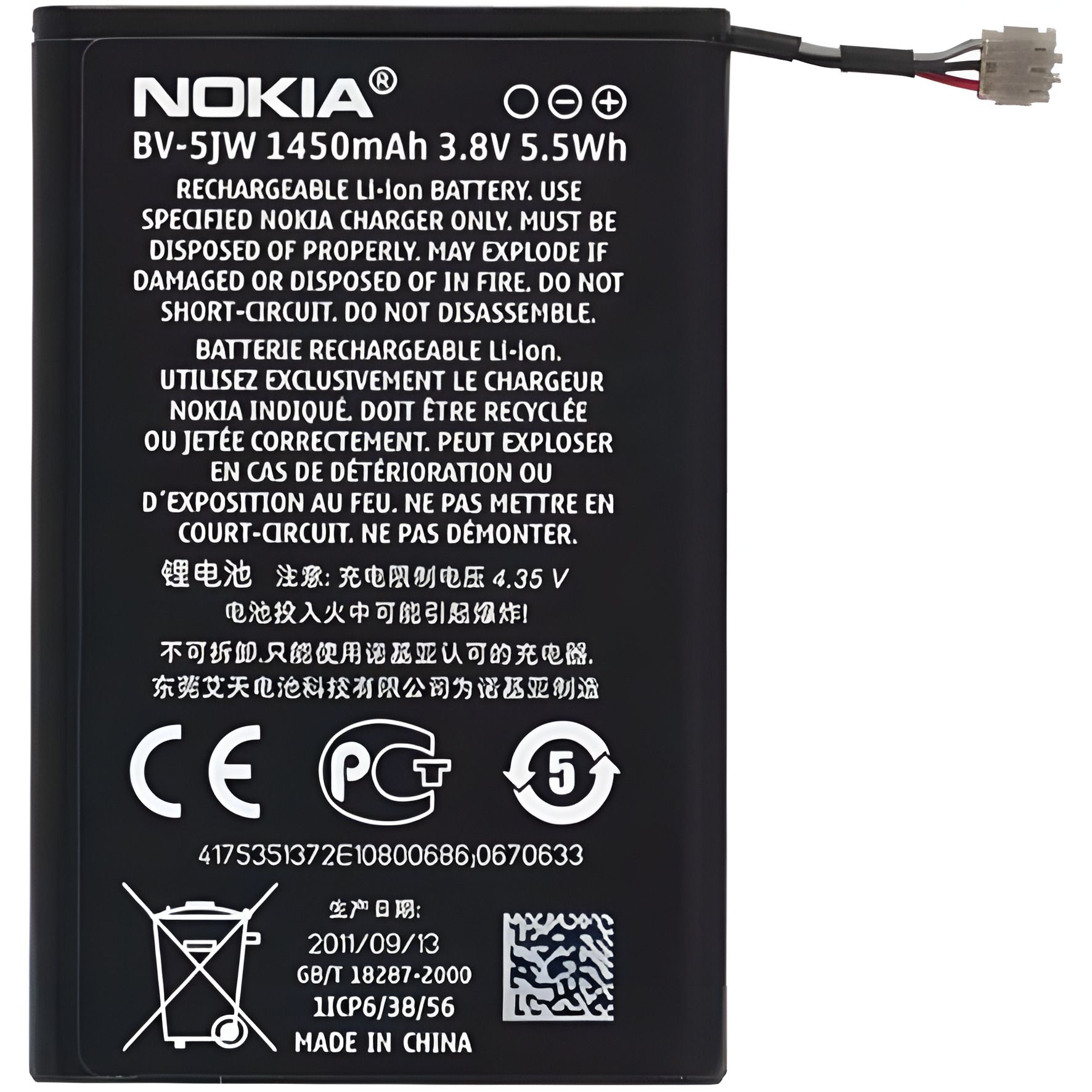 Для моделей Nokia (Microsoft):Lumia 800,N9 Маркировка АКБ:BV-5JW
