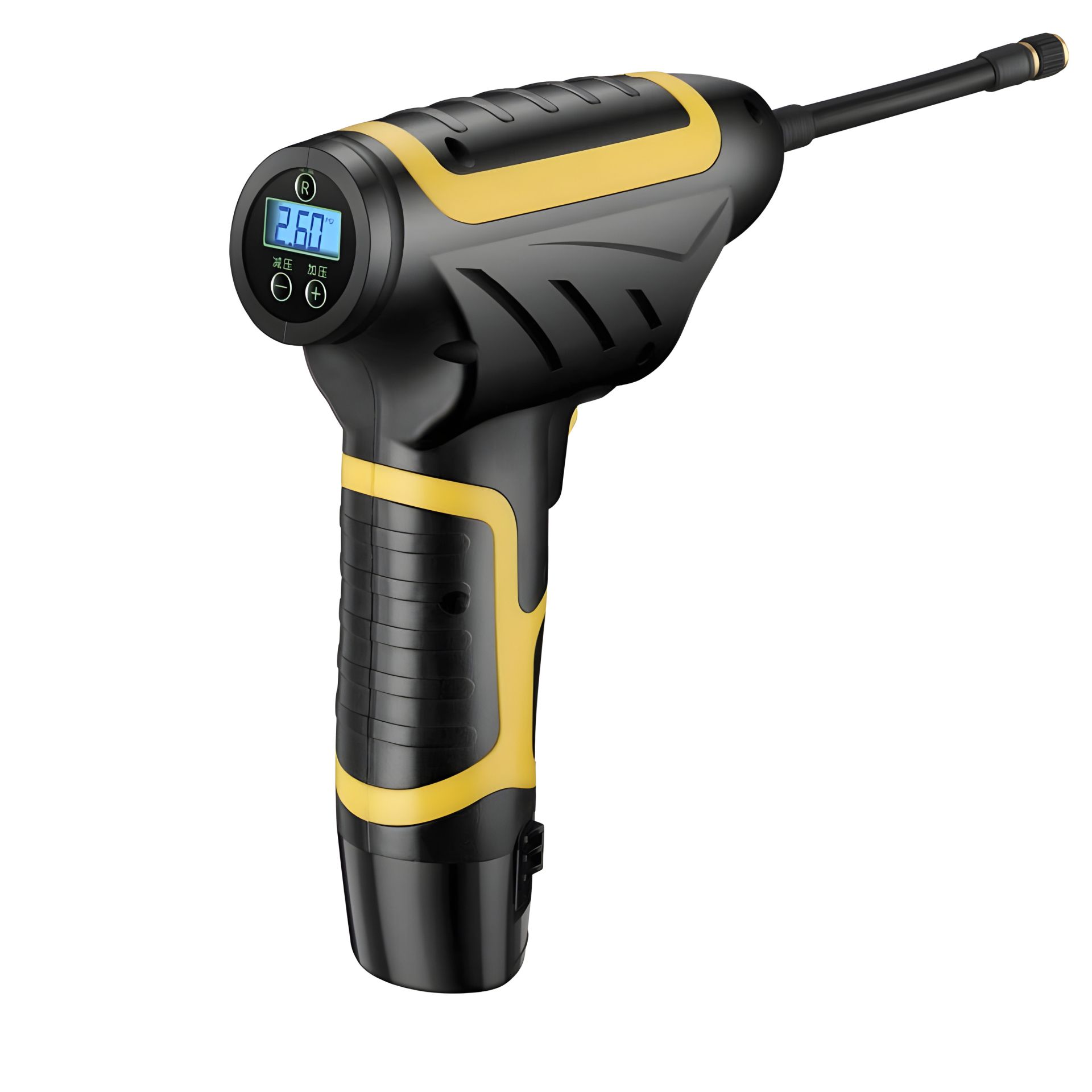 Корпус насоса із міцного пластику має розміри звичайної ручної електродрилі та має знімний літієвий акумулятор 12 вольт 2200 мАг. Увімкнення здійснюється кнопкою, розташованою вгорі ручки. У комплект входять гнучкий шланг, довжиною 13,5 см та 3 різні насадки, включаючи голку для спортивного інвентарю.