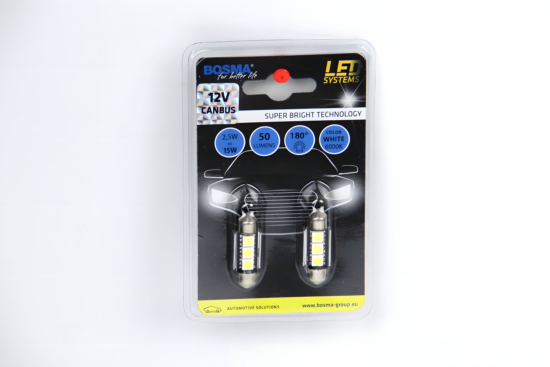 LED автолампа SV8,5 LED 12V 3XSMD 5050 LED WHITE 12X36 DOUBLE POLARITY CANBUS Упаковка 2шт, BOSMA (3741)