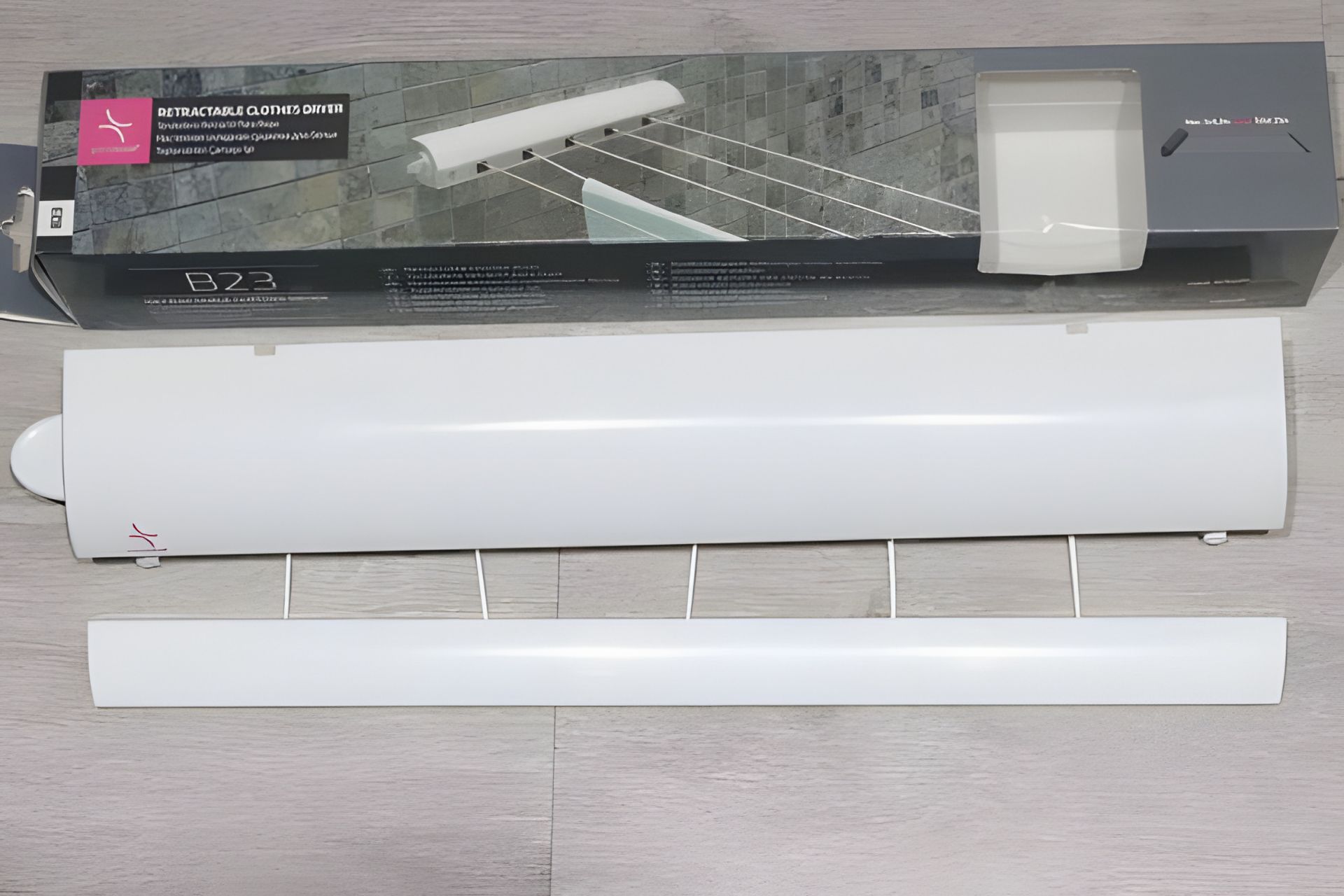 Настенная складная сушилка для белья. Для использования необходимо растянуть и зацепить на противоположной стороне планку с веревками, затем зафиксировать инерционный барабан. Раздвигается на максимальную длину 4,2м. Всего 5 веревок, общая длина веревок 21 м. Производство Турция.