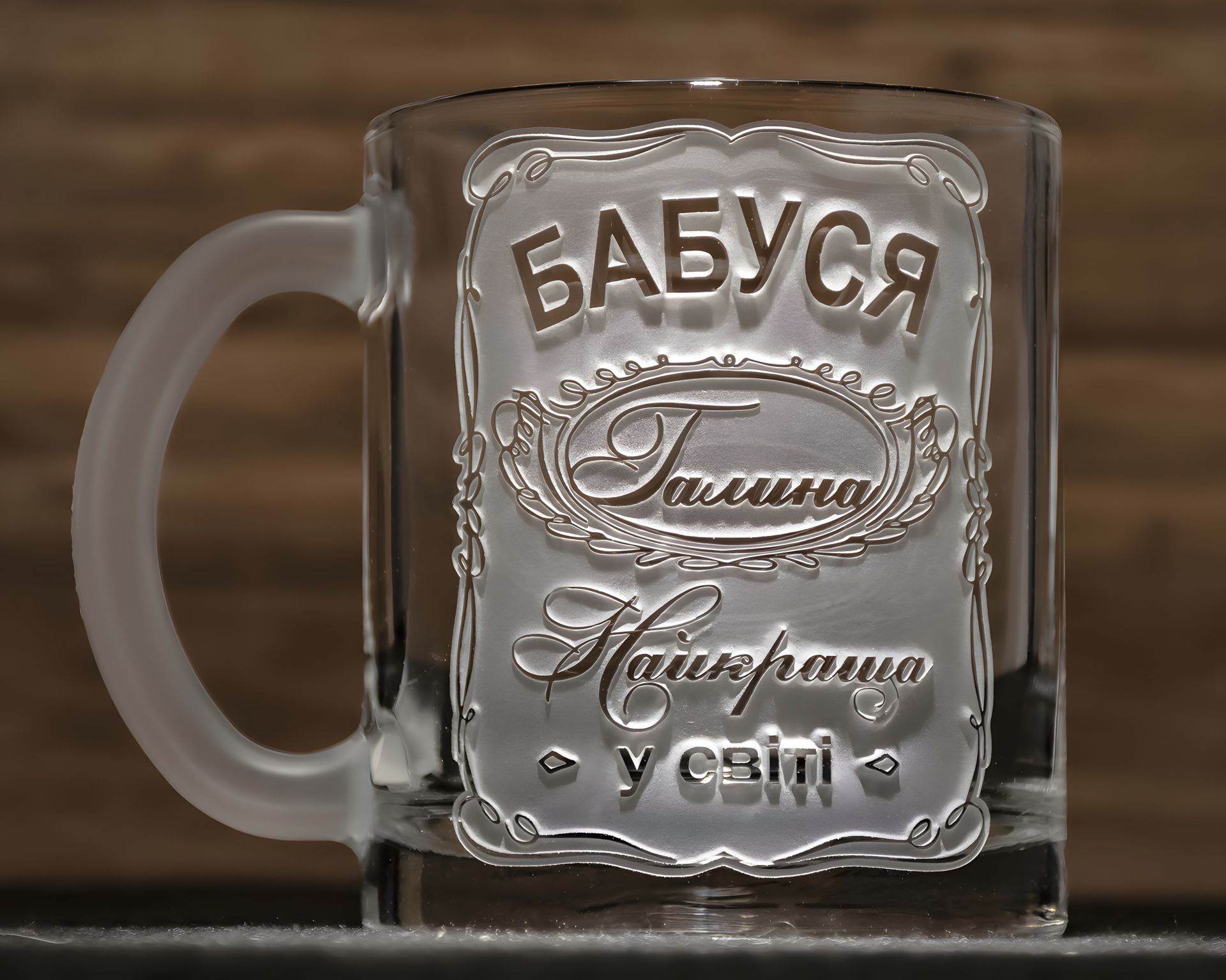 - Гравіювання з характером: Напис вигравіюваний не лазером, не є наліпкою або нафарбованим, а нанесений на скло з використанням особливої технології механічної обробки. Це створює відчуття рельєфу та об'ємності зображення, що надає чашці деякої чарівності.