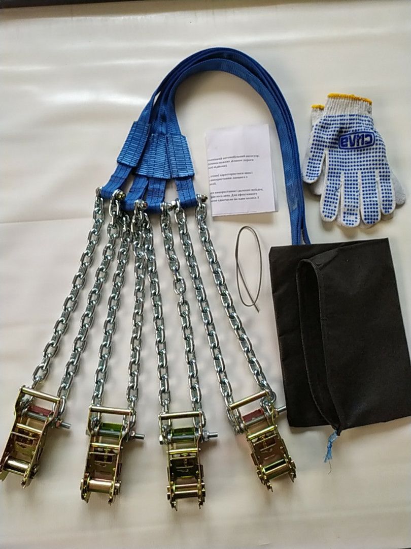 Під час замовлення 4 браслетів підвищення прохідності вашого автомобіля в подарунок йде: рукавички, інструкція, зачіп для протягування ременя через диск, сумка-мішочок для зберігання браслетів.