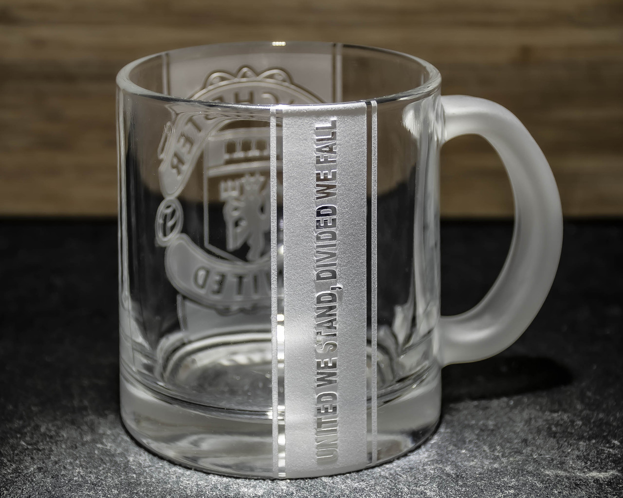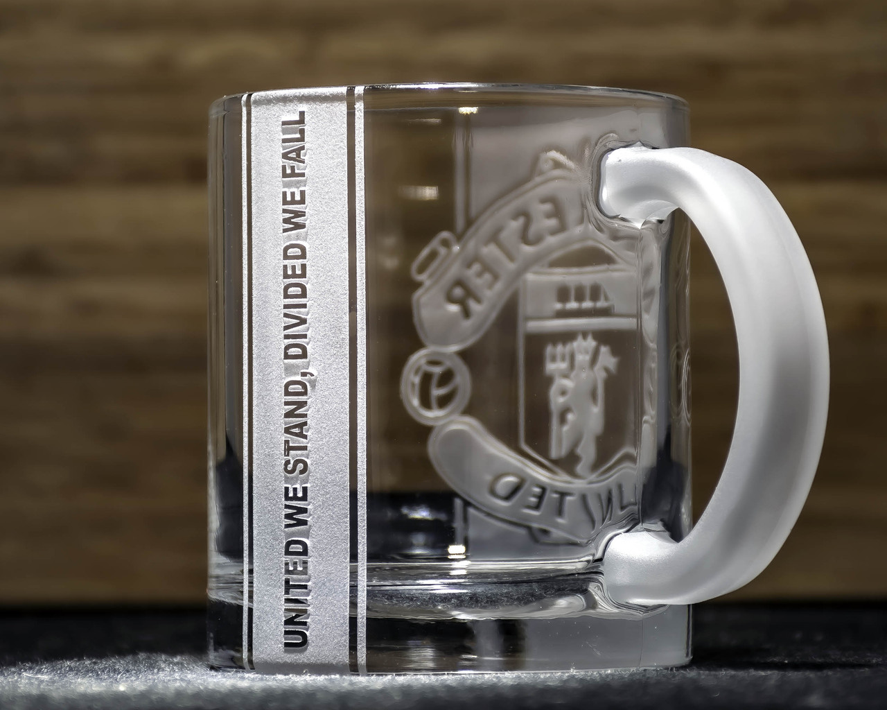 Чашка для чаю та кави з гравіюванням на дві сторони FC Manchester United ФК Манчестер Юнайтед з лозунгом команди і з матовою ручкою