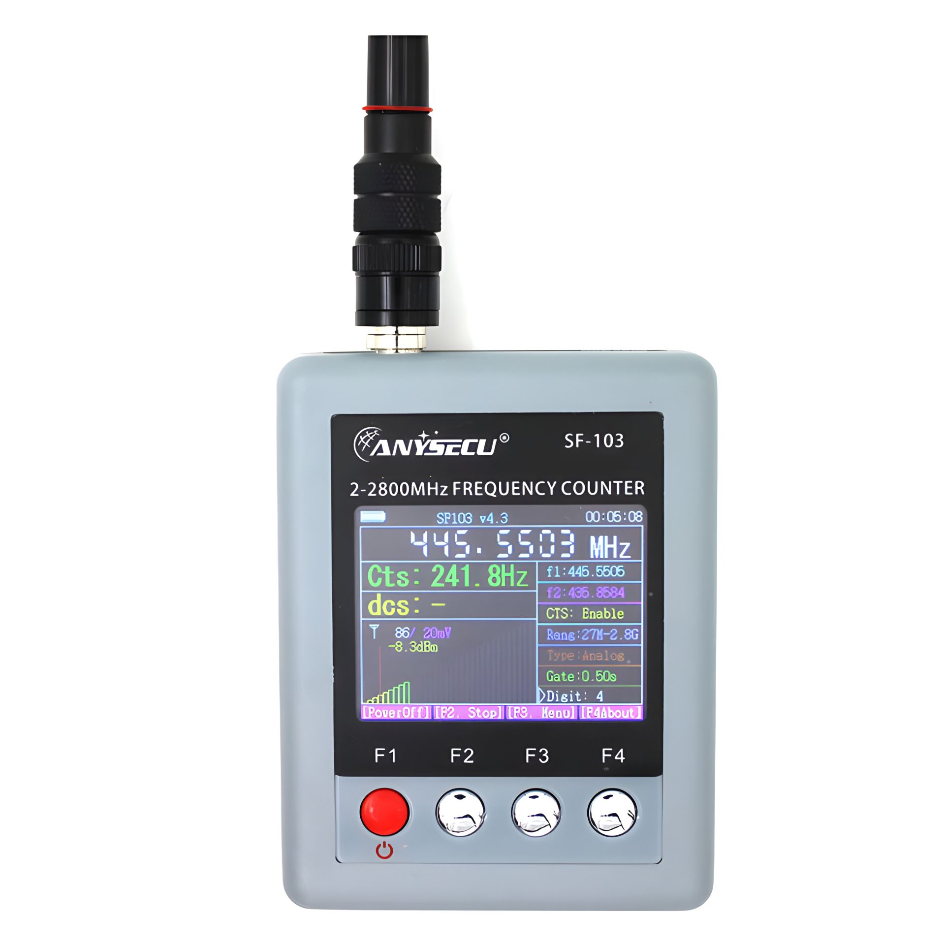 Частотомір цифровий ANYSECU SF-103 з аналізатором CTCCSS/DCS кодів радіостанцій з діапазоном виміру 2 МГц - 2.8 ГГц - дозволить точно дізнатися частоту, на якій передаються дані бездротовим пристроєм (передавачем). Даний прилад являє собою широкосмуговий частотомір основною особливістю якого є можливість показувати код сигналу, який йде з основною частотою радіостанції, якщо він (код) включений в рації. Такий код - це як «ключ», що відкриває трансляцію на ту рацію, на якій встановлено такий же код.