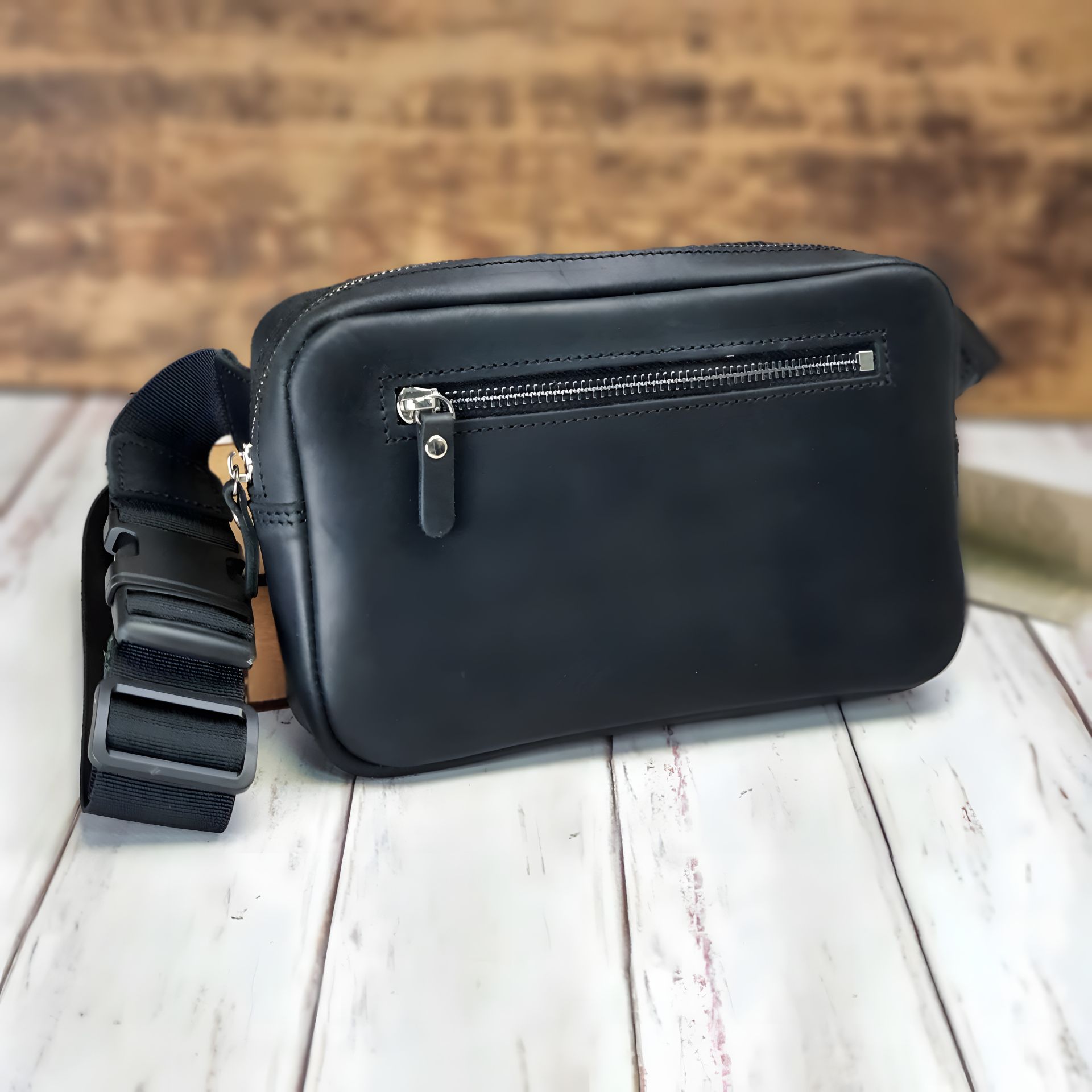 Чоловіча шкіряна сумка-бананка з вінтажної шкіри Crazy Horse Характеристики: Матеріал: натуральна шкіра Crazy Horse Колір: чорний Розміри: 14 см (висота) х 22 см (ширина) х 5 см (глибина) Щільна шкіра зовні і шкіряний підклад забезпечує зносостійкість сумки. Один основний відділ з потайною кишенею на блискавці і додатковою кишенею з візитницею. Зручна кишеня на блискавці спереду на тильному боці Ремінь зі щільної ремінної стрічки з фастексом для регулювання Опис: Чоловіча сумка-бананка з вінтажної шкіри Crazy Horse - ідеальне рішення для тих, хто цінує комфорт і стиль у повсякденному житті. Щільна і міцна шкіра забезпечує довговічність виробу, а її чорний колір надає сумці елегантного зовнішнього вигляду. В основному відділі сумки ви знайдете потаємну кишеню на блискавці, і кишеню трохи менше з вшитою візитницею, що робить організацію ваших речей максимально зручною. Зручна кишеня на блискавці спереду на тильній стороні. Ремінь зі щільної ремінної стрічки з фастексом забезпечує надійне кріплення і регульовану посадку сумки. Сумку зручно носити через плече і на поясі. Ідеально підходить для: Повсякденного використання Подорожей і прогулянок Зберігання документів, карток, грошей, ключів і телефону