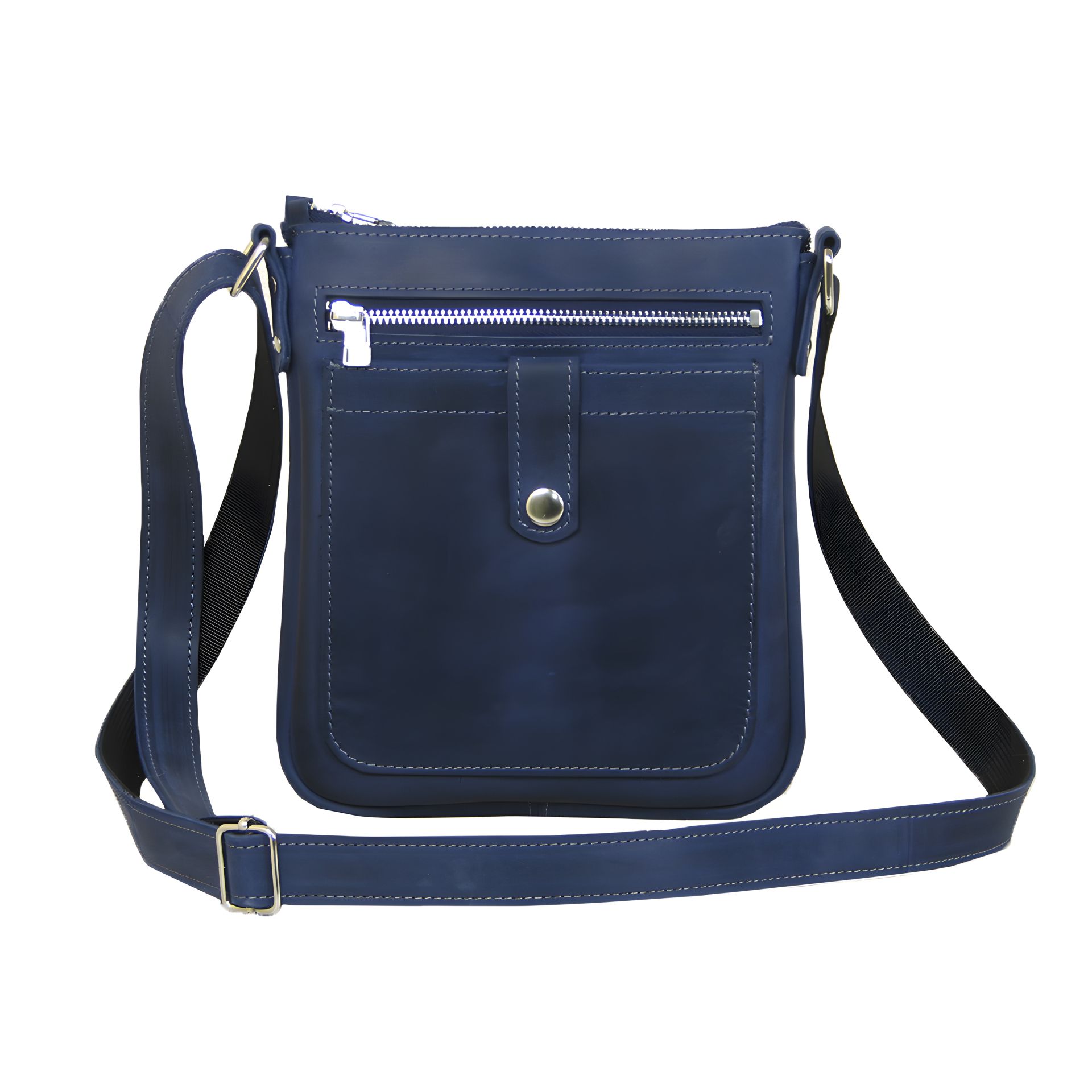 Чоловіча шкіряна планшетка з ременем через плече. Пошита з натуральної телячої шкіри, обробленої воском, вінтажної Crazy Horse. У сумці одне основне відділення з кишенею біля задньої стінки та кишенею менше для телефона, ключів або документів. Спереду, на тильній стороні, 2 кишені: одна на блискавці, друга закривається хлястиком на кнопці. Ремінь через плече (150 см) обшитий шкірою й регулюється за довжиною. Розміри сумки 22*20*3 см
