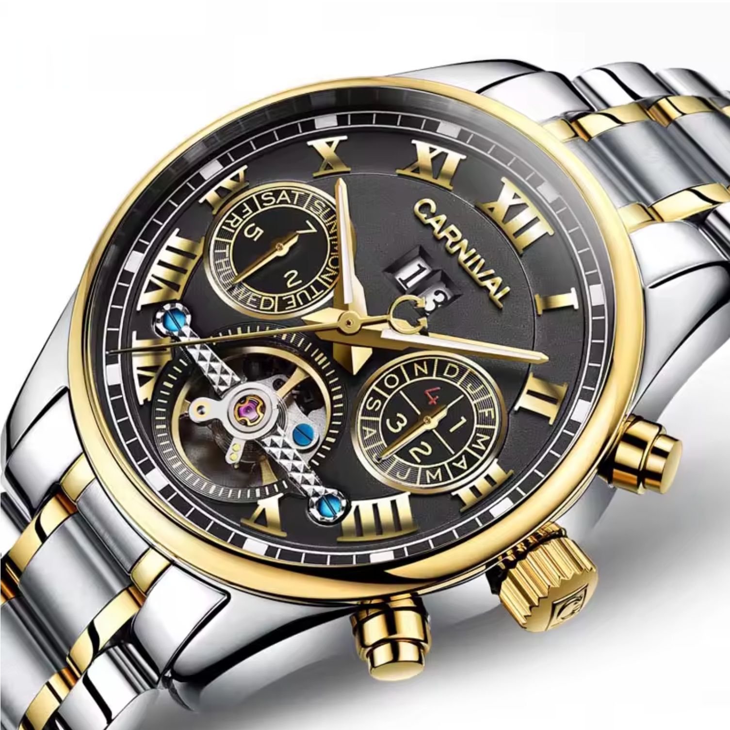 Чоловічі механічні годинники Carnival – це втілення престижу та надійності у кожній деталі. Оснащені високоточним японським механізмом із 25 каменями, вони забезпечують стабільну та довговічну роботу. Завдяки сапфіровому склу годинник стійкий до подряпин і зберігає бездоганний вигляд протягом багатьох років.Ми пропонуємо офіційну гарантію 12 місяців та є єдиними ексклюзивними представниками Carnival в Україні, що гарантує оригінальність кожної моделі.Основні переваги Carnival: • японський механізм із 25 каменями; • міцне сапфірове скло; • офіційна гарантія 12 місяців; • ексклюзивна дистрибуція в Україні; • преміальний дизайн та бездоганна якість.Годинники Carnival створені для чоловіків, які цінують престиж, точність та безкомпромісну якість.