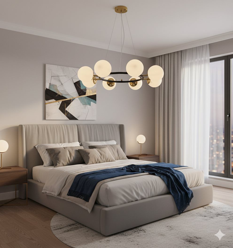 Вісім круглих плафонів: Білі скляні плафони м'яко розсіюють світло, створюючи комфортну та затишну атмосферу у вашому просторі.