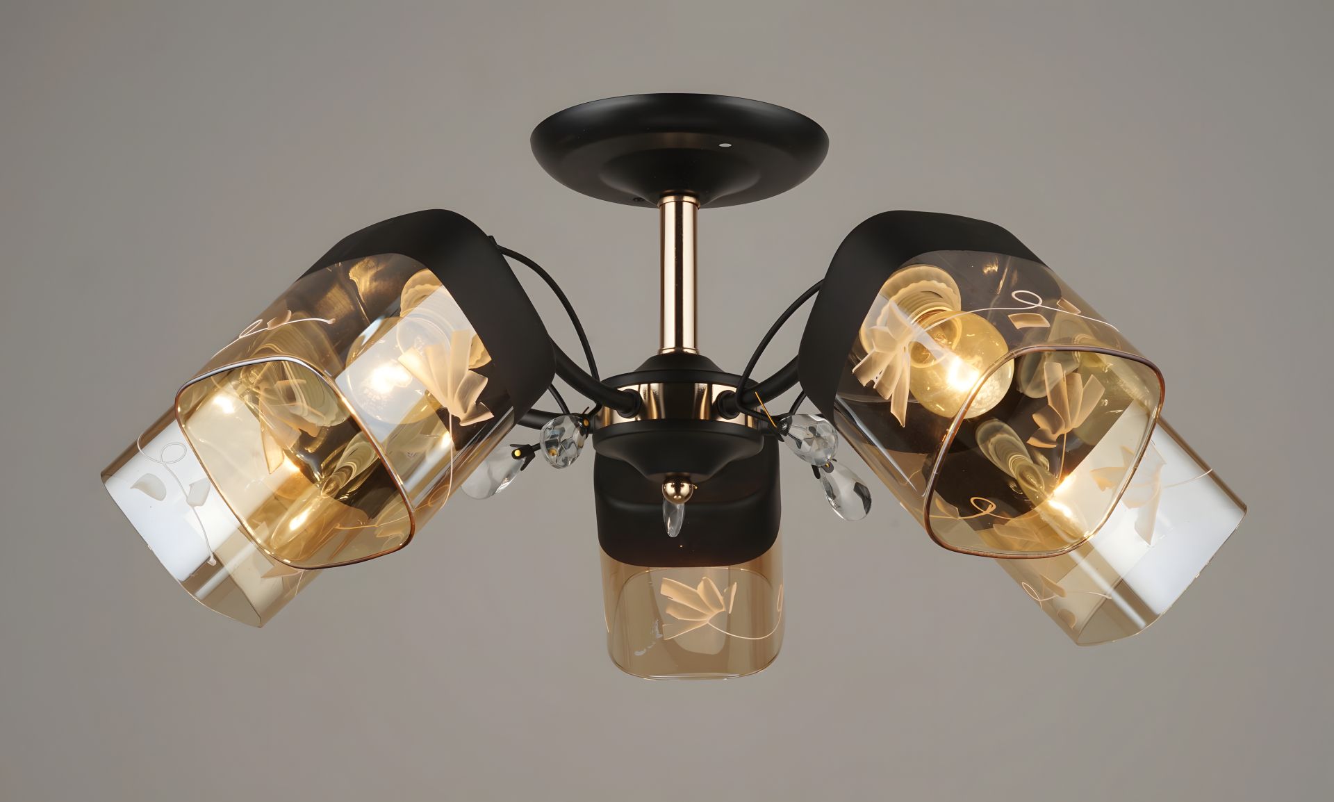 Каркас з металу в чорному та золотистому кольорі додає особливої розкоші та вишуканості. П'ять плафонів зі скла в чорному кольорі з золотистим відтінком створюють неповторну гру світла та тіней, даруючи вашому приміщенню атмосферу елегантності.