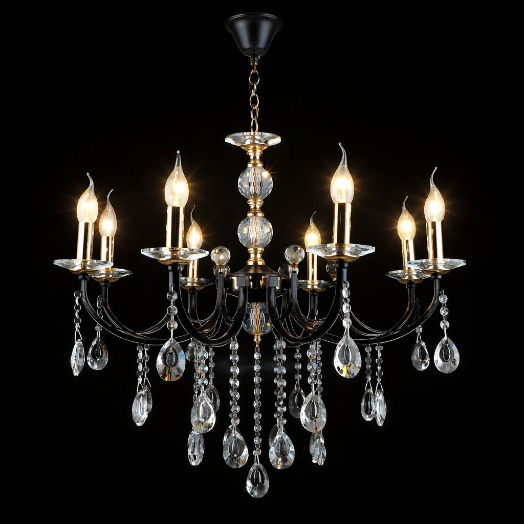 Основа люстри виготовлена з металу бронзового кольору, що надає їй сучасний та стильний вигляд. Скляні підвісні елементи надають люстрі додатковий шарм та магію. Вони переливаються та відображають світло, створюючи різні відтінки та вигини, які вражають непередбачуваністю.