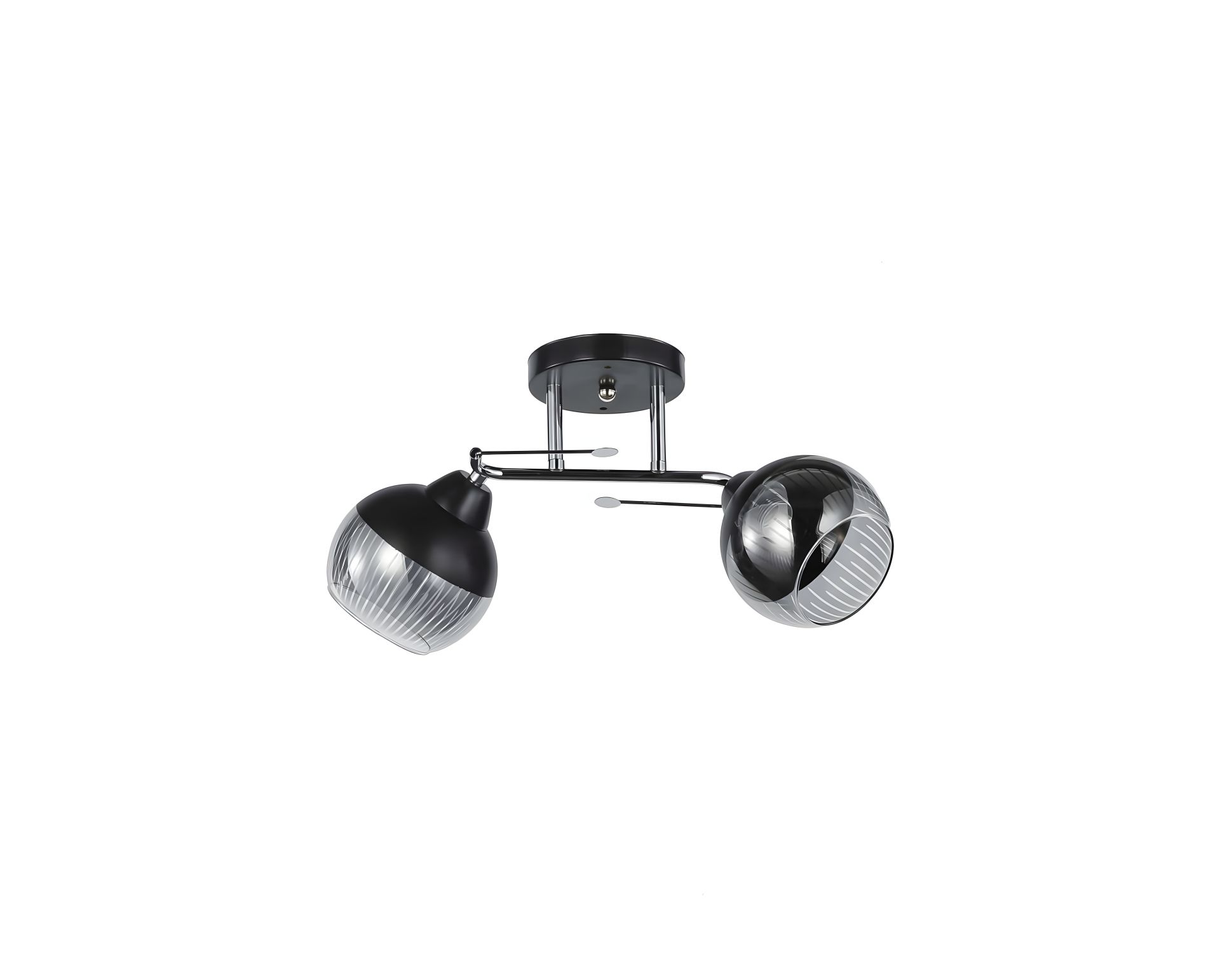 З її розмірами 450 мм довжина, 240 мм ширина і 250 мм висота, ця люстра ідеально підходить для кімнат невеликого розміру. Завдяки металевому каркасу в кольорі хром з чорним, вона виглядає дуже стильно та сучасно. Два круглі плафони зі скла чорного кольору додають неабиякої елегантності, а хромові деталі на плафонах приносять чарівний блиск.