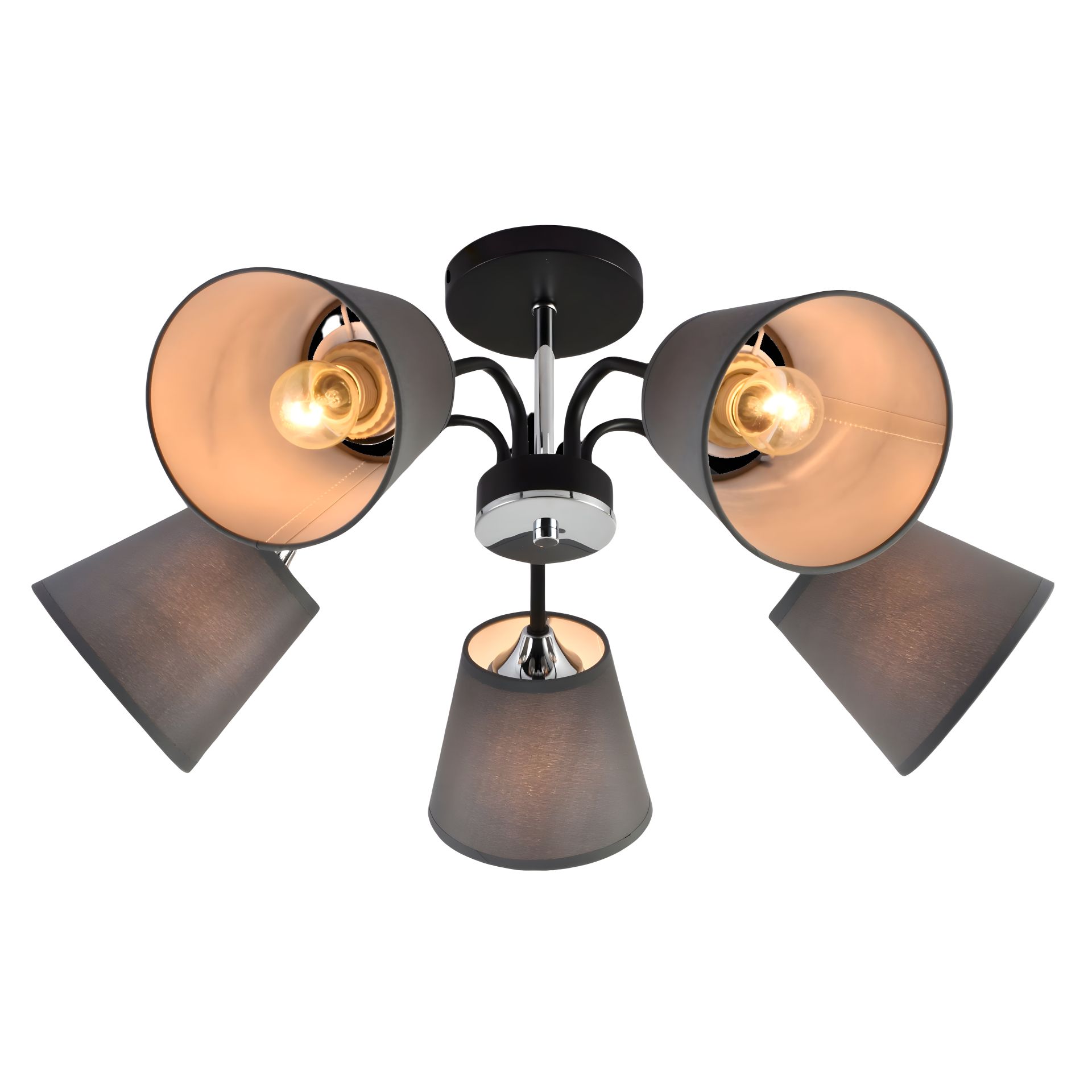 П' ять плафонів з текстилю чорного відтінку надають цій люстрі неповторний шарм та вишуканість. З цоколем Е27, який підтримує лампочки до 60 Ватт, ви зможете створити приємне та затишне освітлення, яке відповідає вашим потребам.