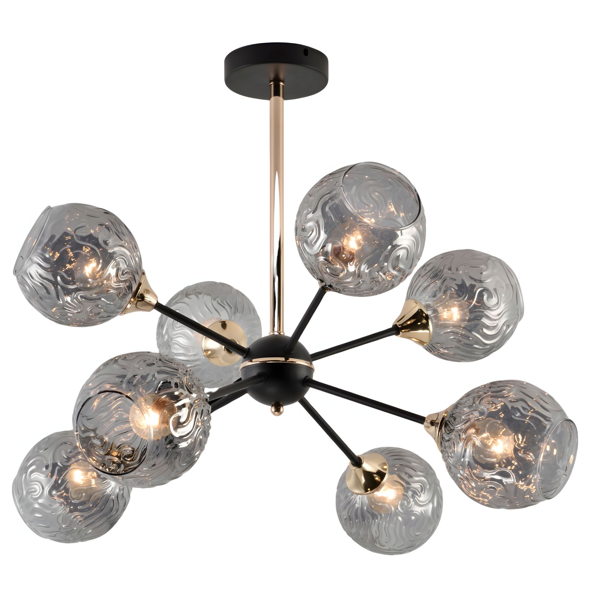 Каркас, виготовлений з металу, виконаний у чорному та позолоченому кольорі, надає їй елегантний та сучасний вигляд. Вісім плафонів зі скла, із хромовим відтінком, створюють теплу атмосферу в вашому приміщенні.