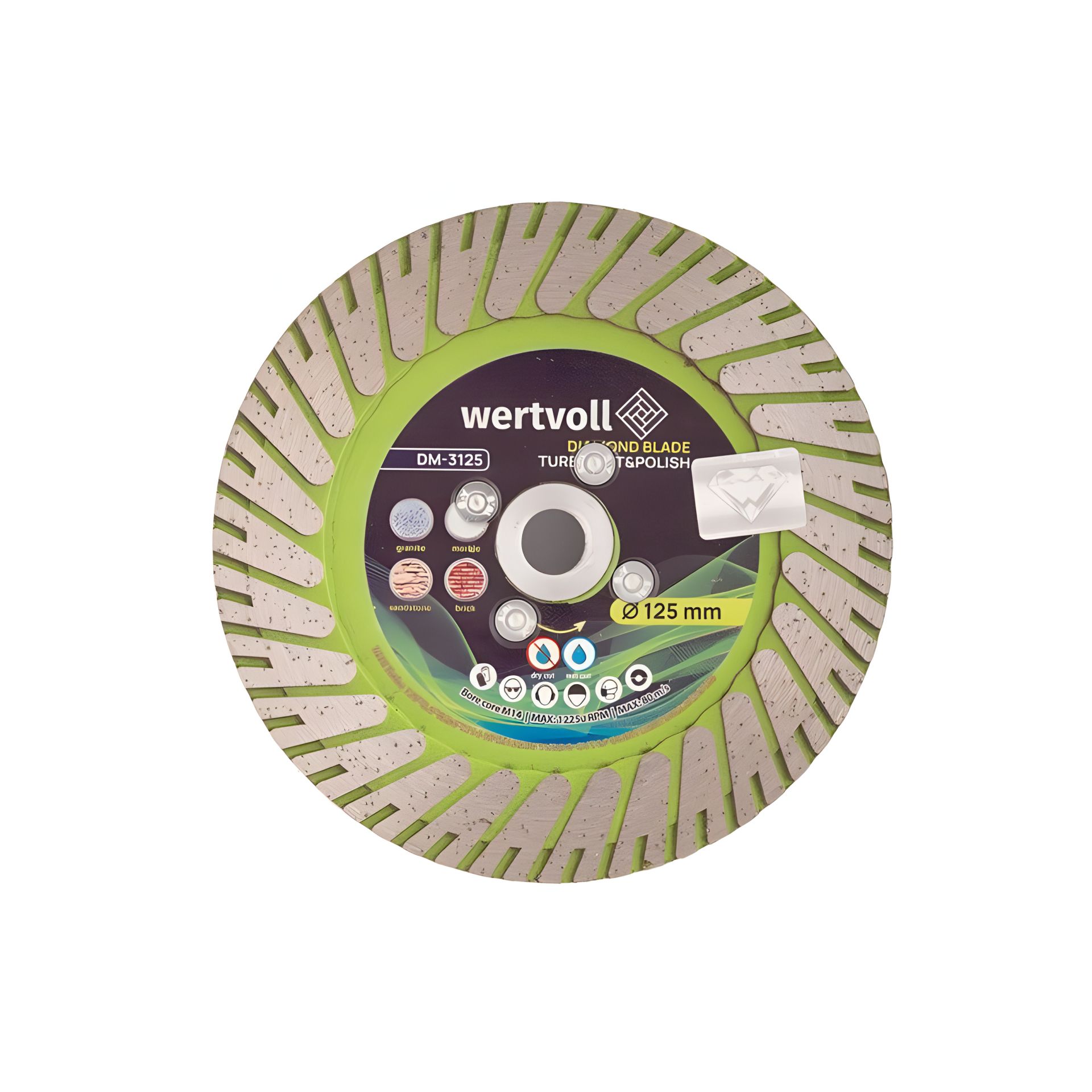 алмазний диск cut&polish , диск для граніту , диск для обробки кромки , turbo диск 125 мм , WERTVOLL , диск з кріпленням M14 , диск по каменю , DM-3125 Алмазний диск TURBO CUT&POLISH 125×2,8 мм, Ø2 12 250 об/хв WERTVOLL (DM-3125)